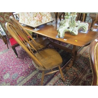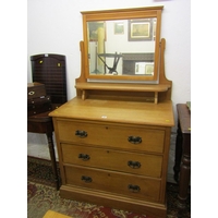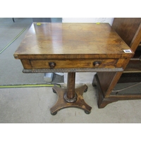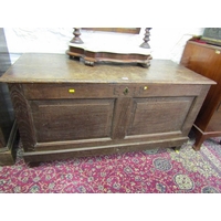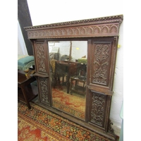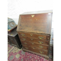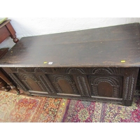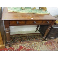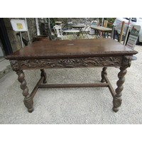 MID 19TH CENTURY GOTHIC OAK TABLE, with plaque to centre 'made in 1859 from beams taken from the house of Mary of Guise, Castle Hill Edinburgh', the top with carved foliate edge, the base with mask decoration, the drawers with carved thistle decoration, the central drawer fitted a writing slope, the legs of barley twist design with carved stretcher on bun castor feet 48" x 31".Hammer: £580