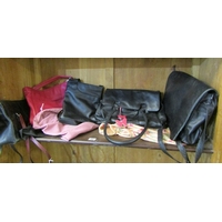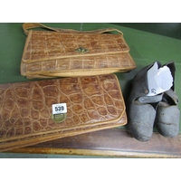 LUGGAGE, An old leather suitcase with leather carrying handle with brass catches and mounts, owners initials C.H.B. in black to front, interiors makers mark for John Pound & Co, Regent Street, London, together with a vintage blue leather suitcase with fitted interior in cloth carrying case and a mid brown tan leather briefcase (3).- Previous