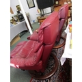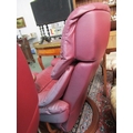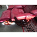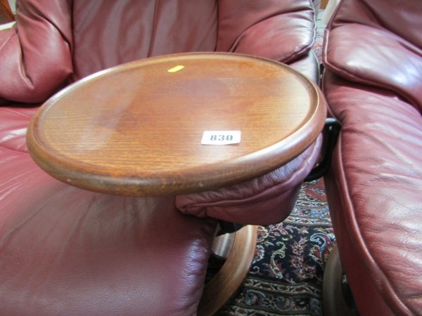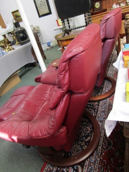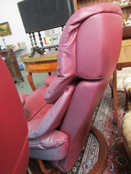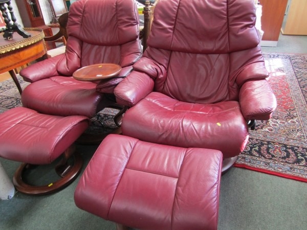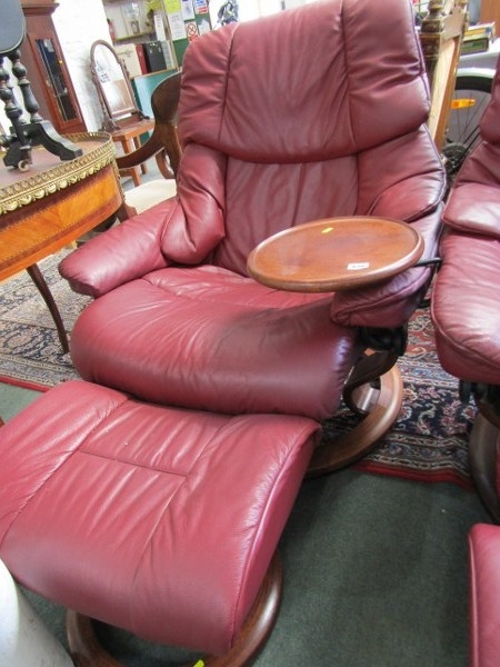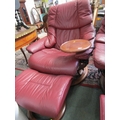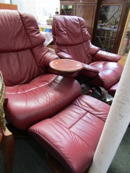 STRESSLESS ARMCHAIRS & FOOTSTOOLS, pair of burgundy, leather Stressless reclining armchairs, one with oak swivel arm rest and matching footstools