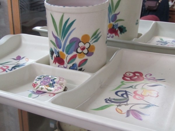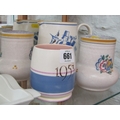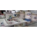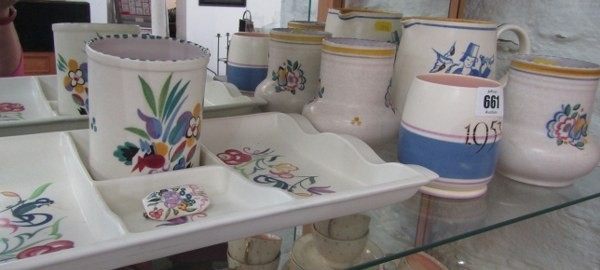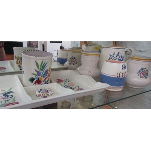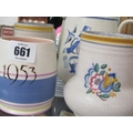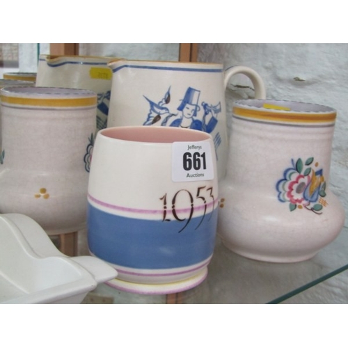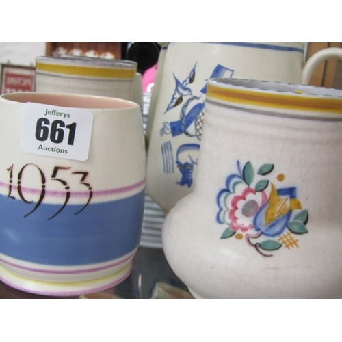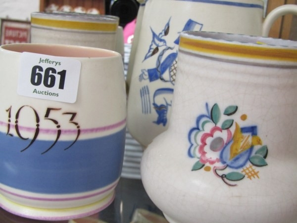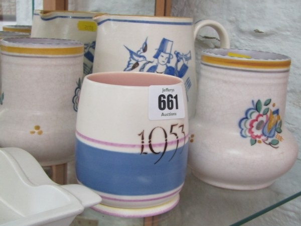 POOLE POTTERY, a 1930's Poole Pottery Nursery jug "Littleboy Blue" pattern, a 1953 Coronation beaker, 3 early vases, seriving dish & brooch
