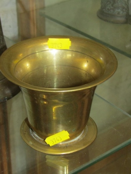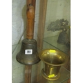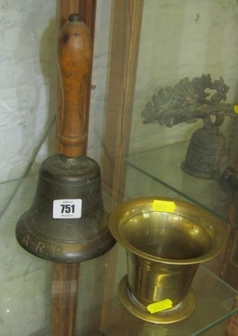 HAND BELL, a brass A.R.P. hand bell with wooden handle, together with a brass mortar