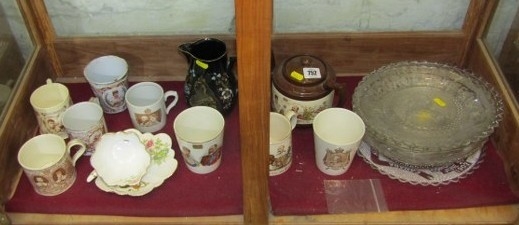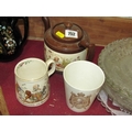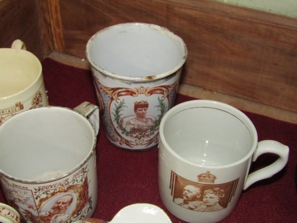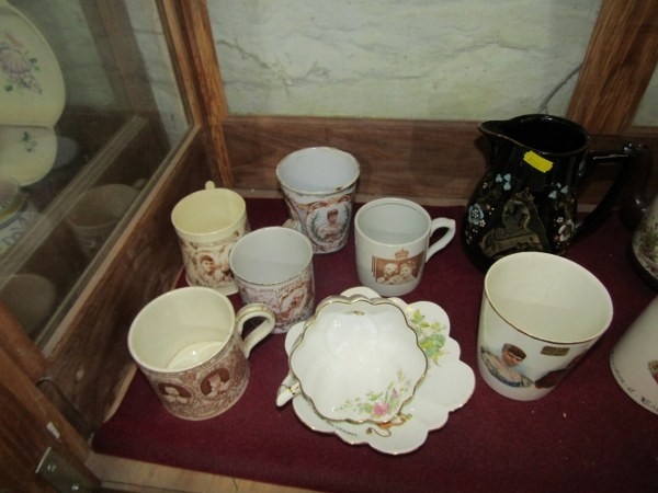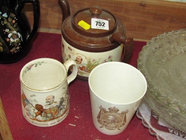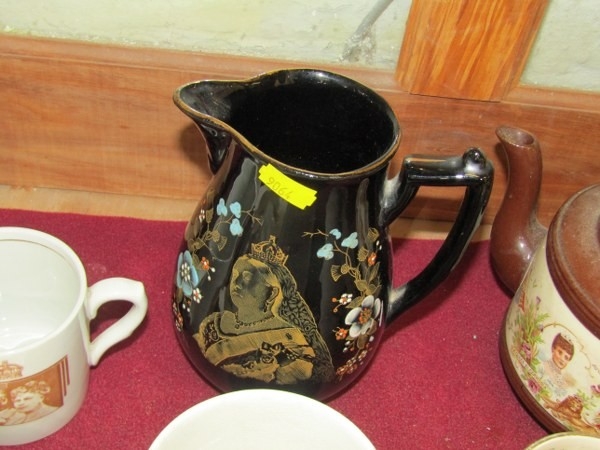 COMMEMORATIVE WARE, a Jackfield pottery, Queen Victoria commemorative jug, together with various other mugs and glass commemorative dishes