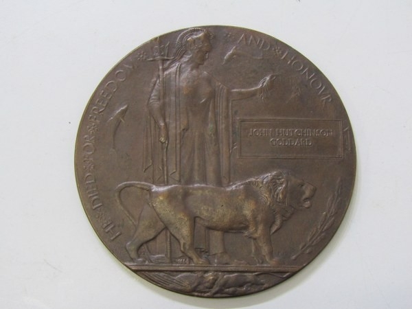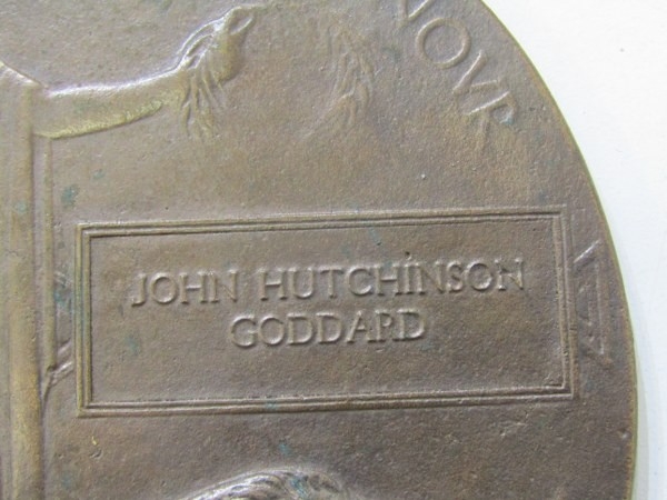 DEATH PLAQUE, WWI death plaque to John Hutchinson Goddard