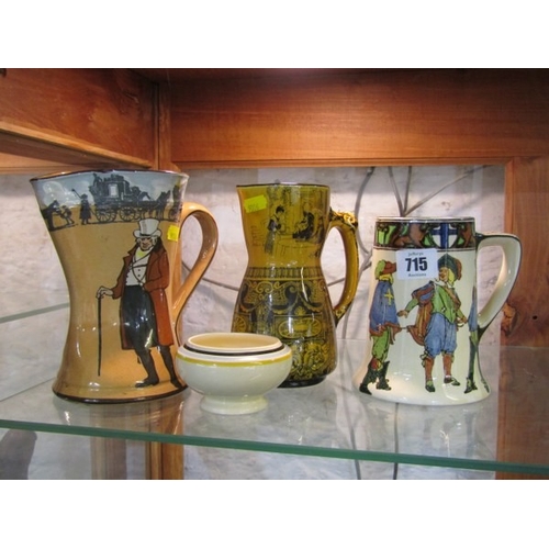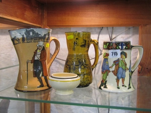 ROYAL DOULTON, a Royal Doulton 'Jacobean' seriesware jug together with a coaching series jug, a seriesware mug and a small Doulton bowl