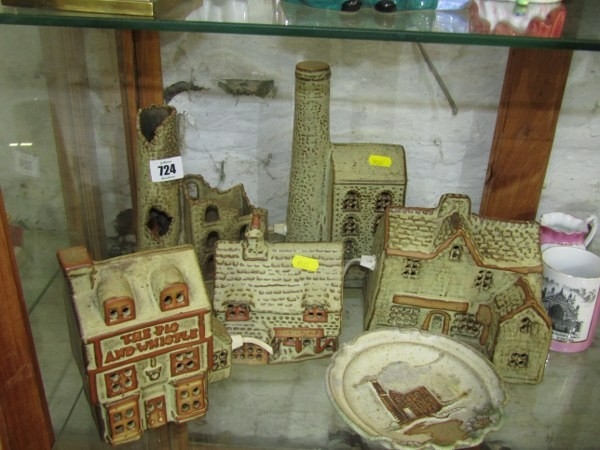 CORNISH POTTERY, 2 Cornish pottery models of tin mines together with 3 other cottages and a pottery dish