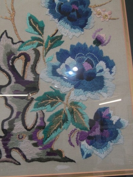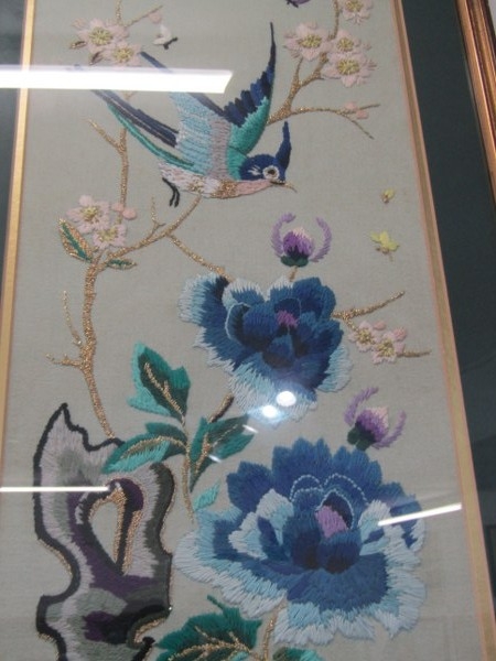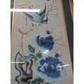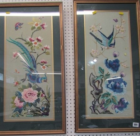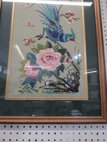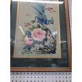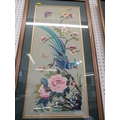 ORIENTAL TAPESTRY, a pair of floral and bird decorated oriental influenced tapestry pictures