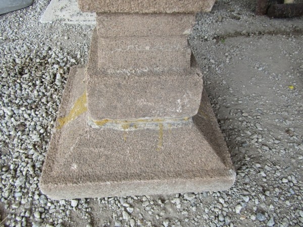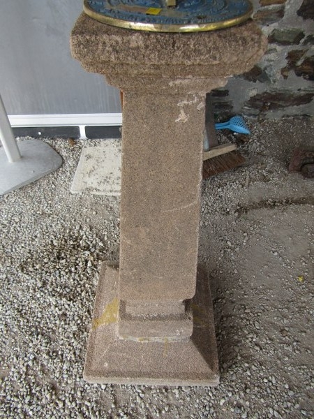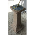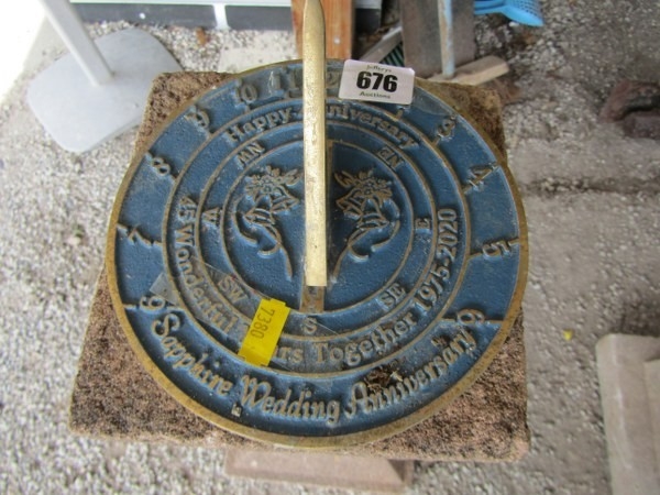 ANNIVERSARY SUN DIAL, brass sun dial on a square form tapering stonework base, 76cm height repaired