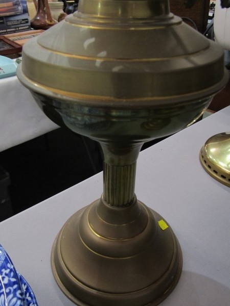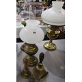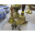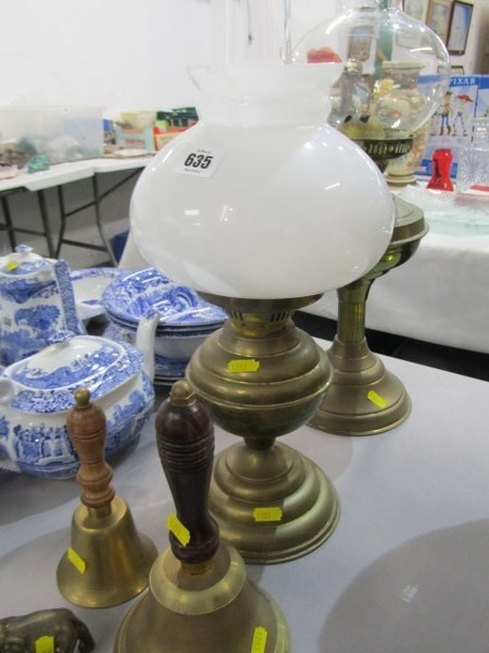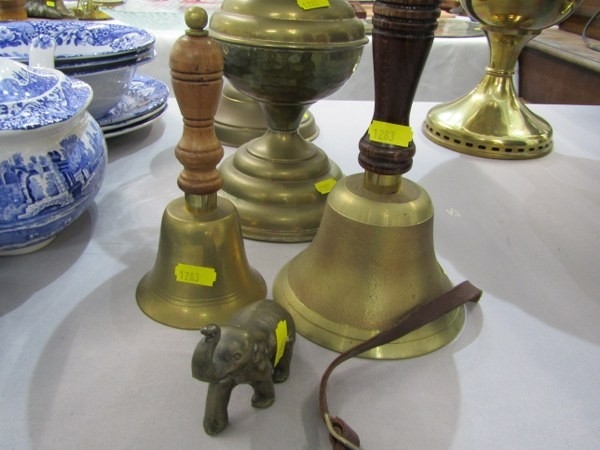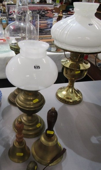 OIL LAMPS, 2 brass oil lamps together with a brass elephant & 2 brass & wooden handled hand bells