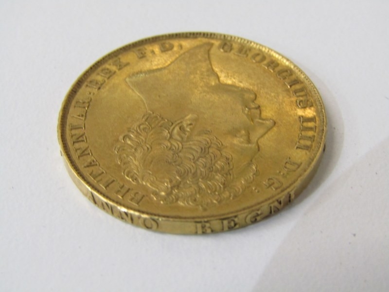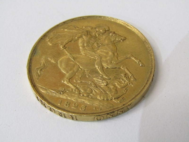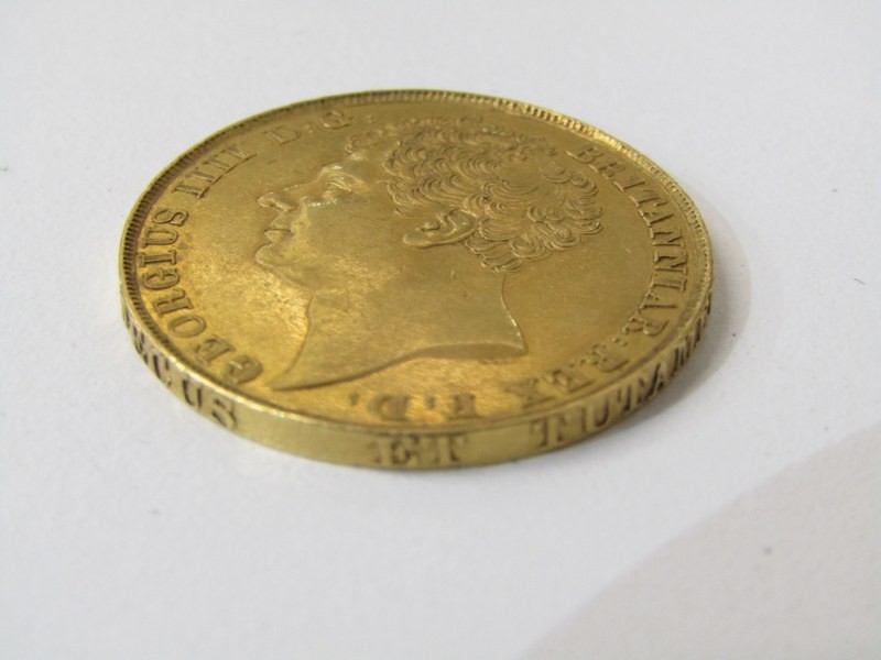 1823 George IV gold two pounds. ‘Large Bare Head’ with St George & the Dragon on reverse. Edge inscription ‘Anno Regni IV in higher grade, Tower Hill Mint 15.98 grams (2 x sovereigns) of 22ct gold.