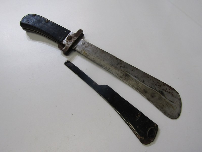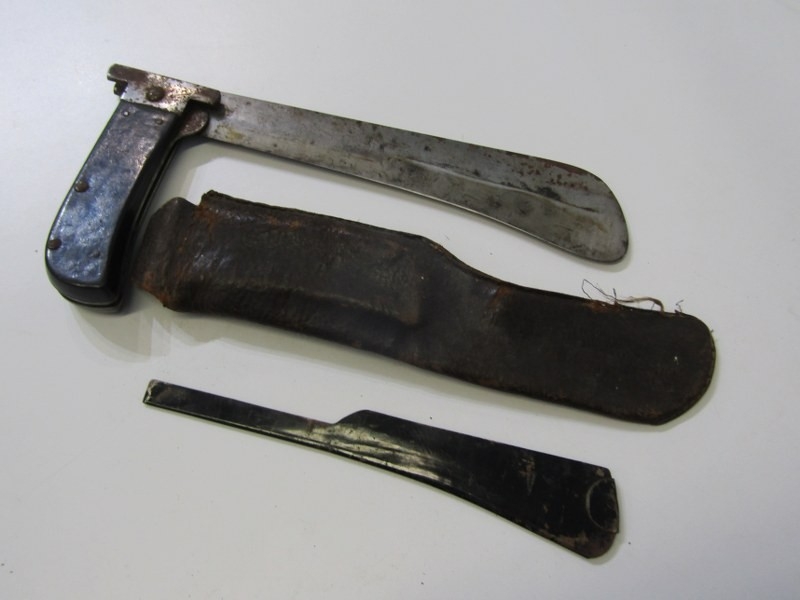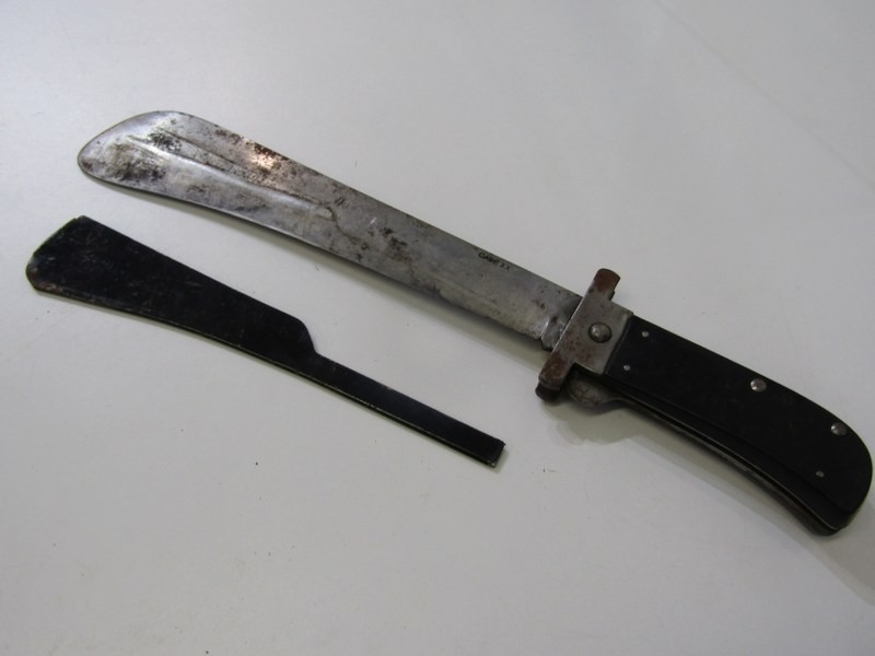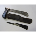 AIRMAN'S SURVIVAL MACHETE, USA WWII Airman's folding survival machete, marked case in leather scabbard