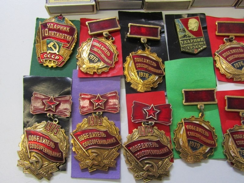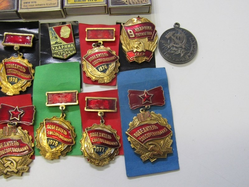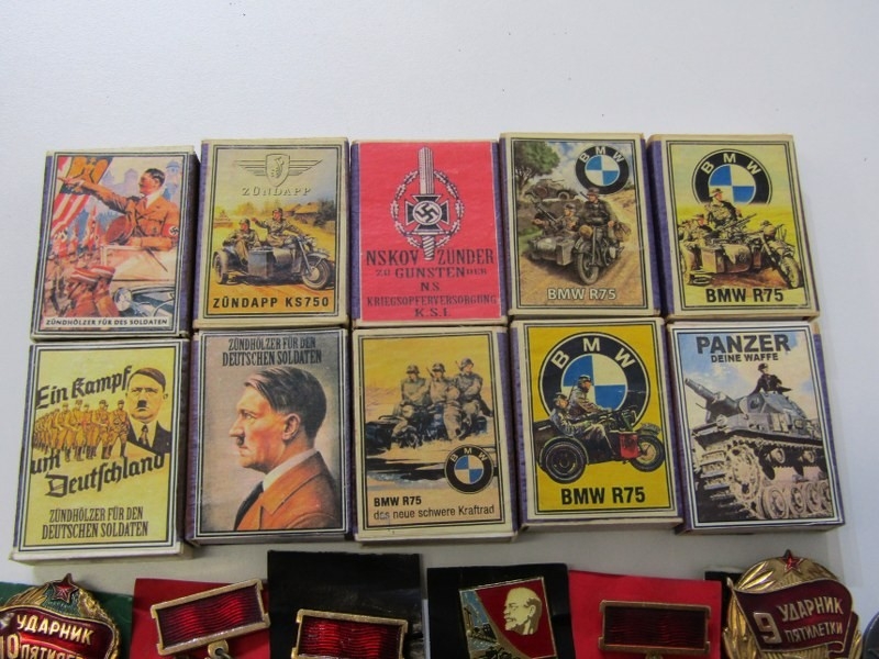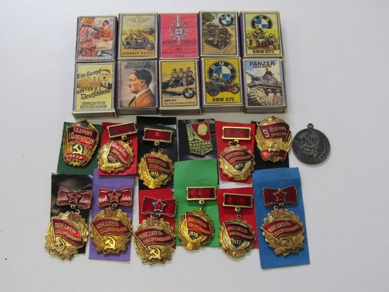 GERMAN PROPAGANDA MATCHBOXES; 10 assorted German propaganda matchboxes, together with a collection of Russian enamelled medals and badges