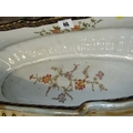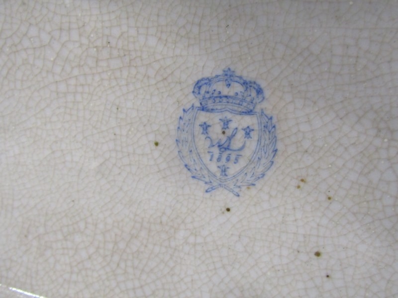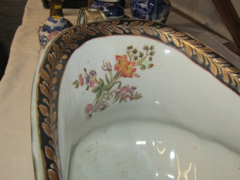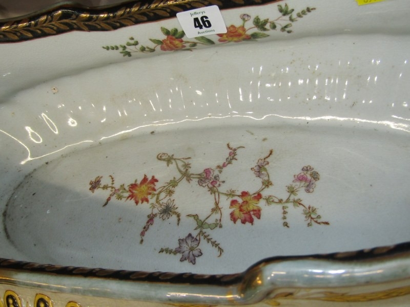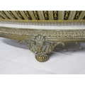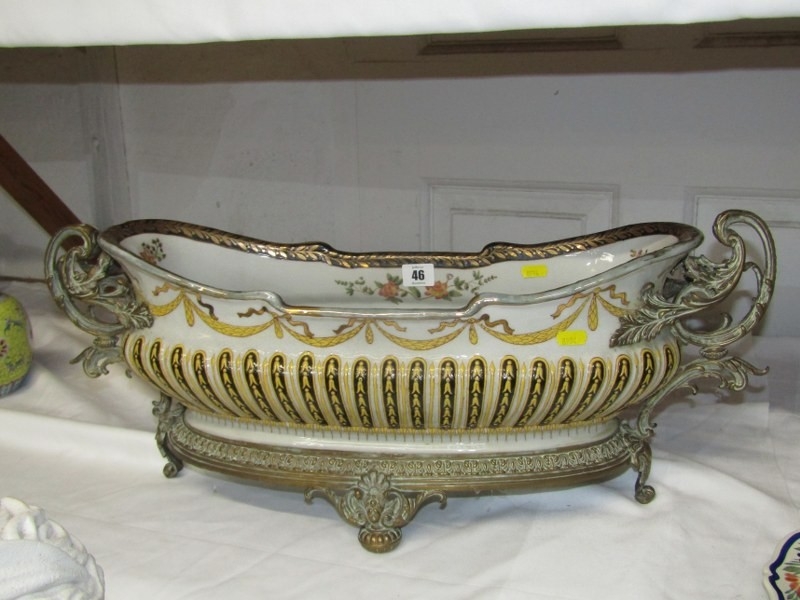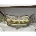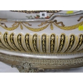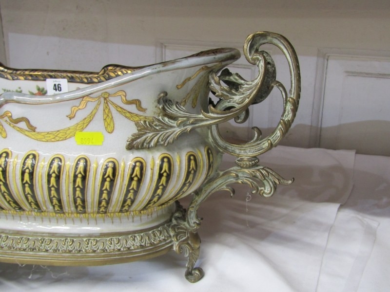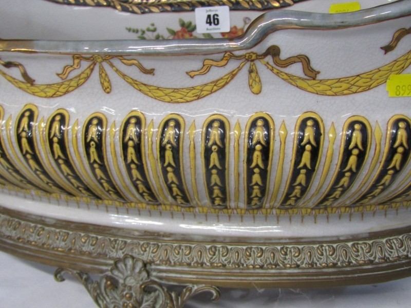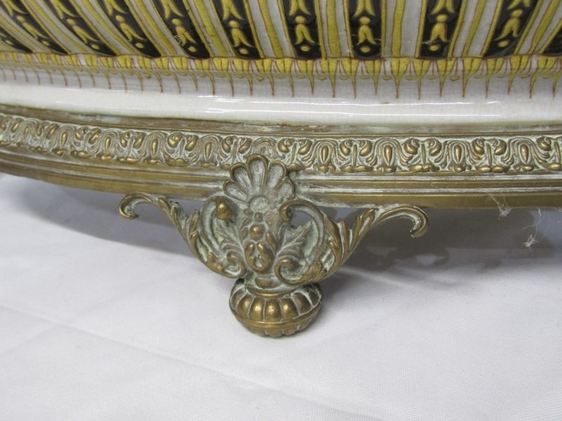 ANTIQUE POTTERY TABLE CENTRE, large oval table centre with swag and fluted decoration with gilt metal mounts and base, possibly by William Lowe, 65cm width