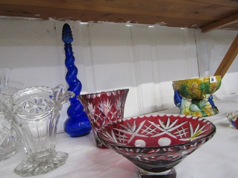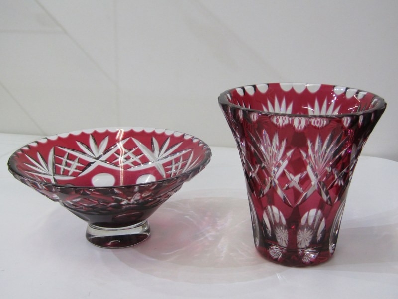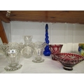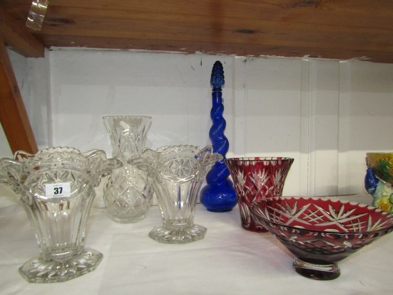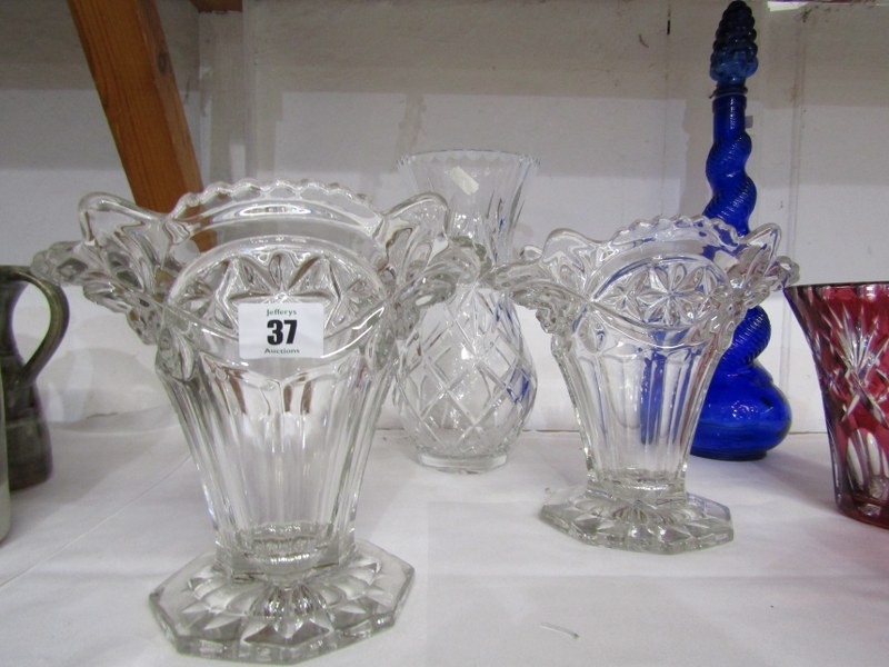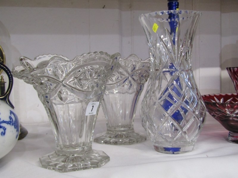 CUT GLASS, cut glass flower vase of baluster form, pair of moulded glass vases, 2 red flash glass vases, etc