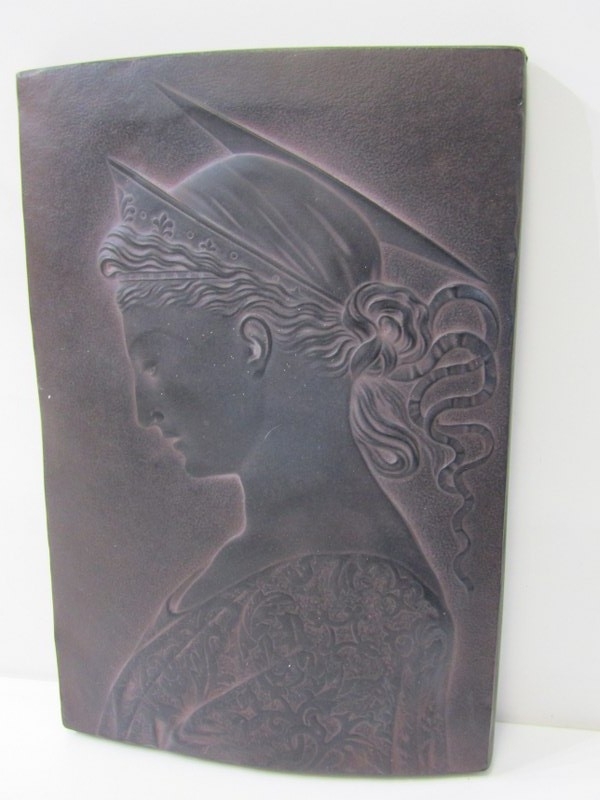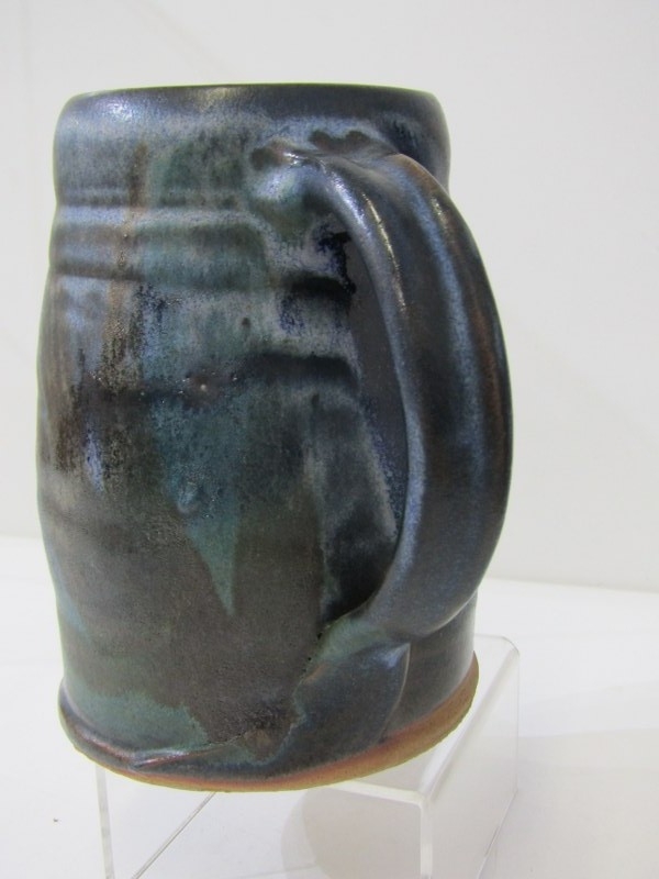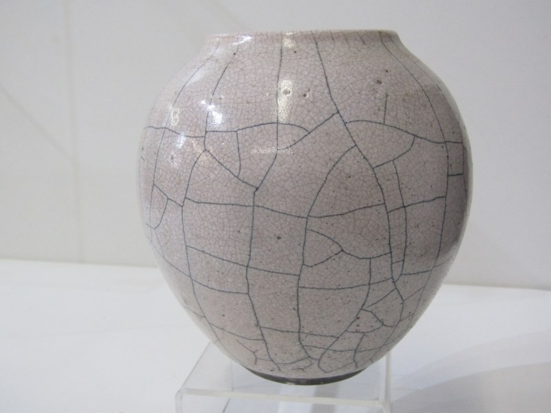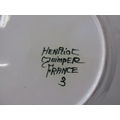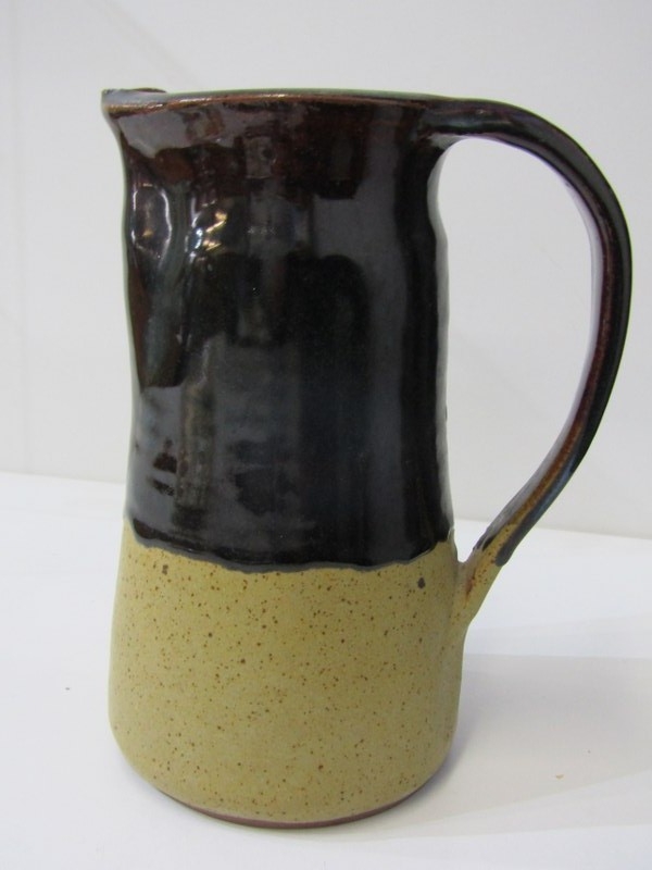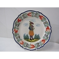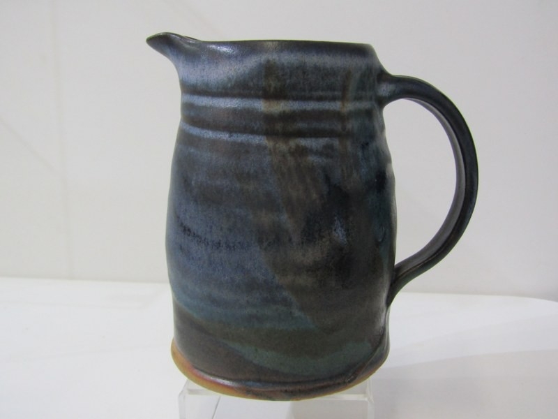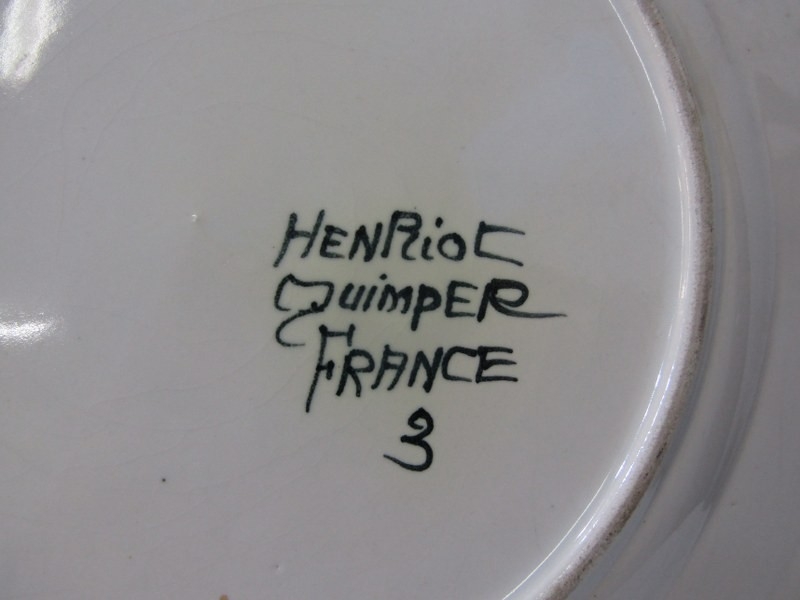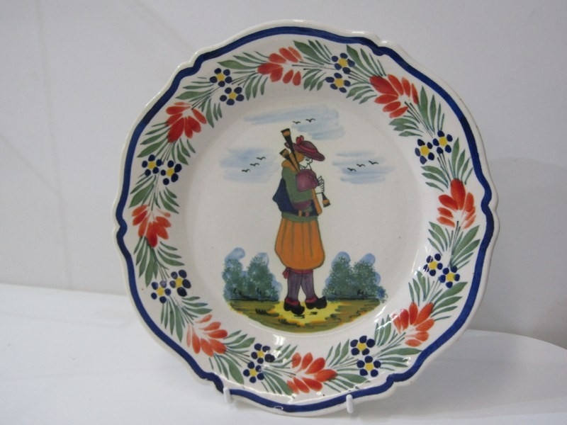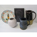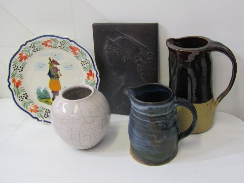 ART POTTERIES, art pottery blue glazed jug, studio pottery crackle glaze vase, with potter's mark, moulded plaque of Saint Ceoilia (patron saint of musicians), Quimper French plate, etc