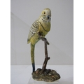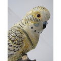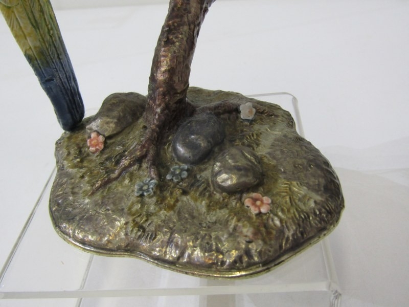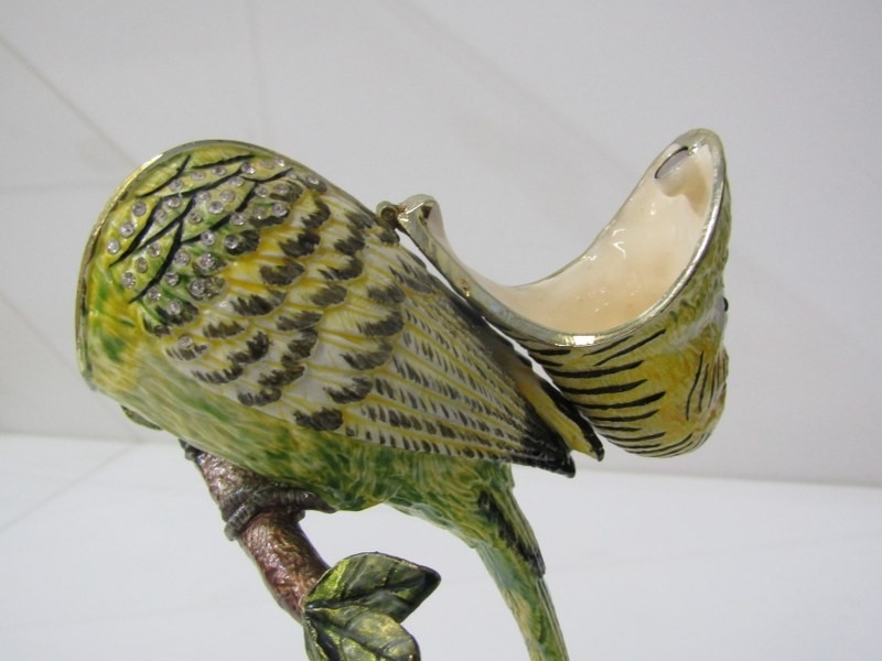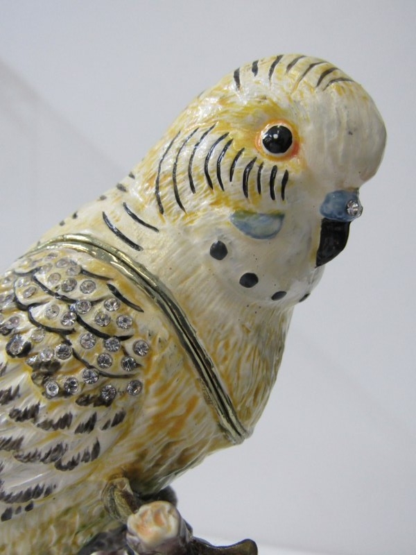 FLOCK OF BUDGERIGARS, 3 metal budgerigar ornaments on floral stands, each with rising heads, with compartment interior, 19cm height