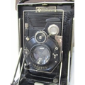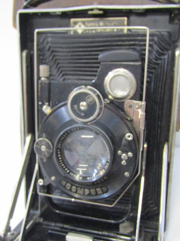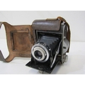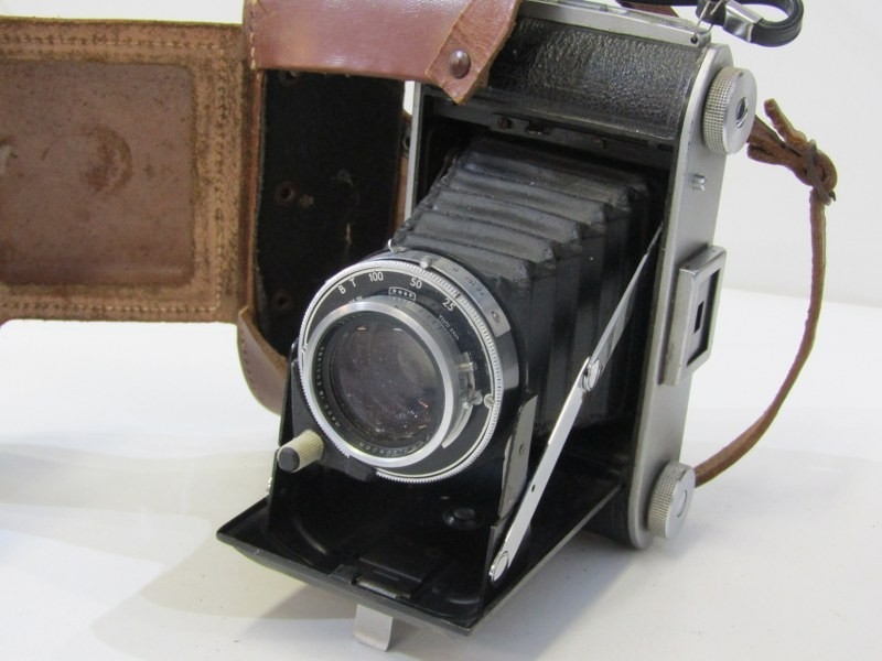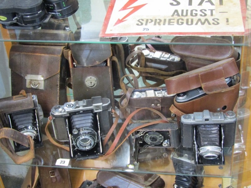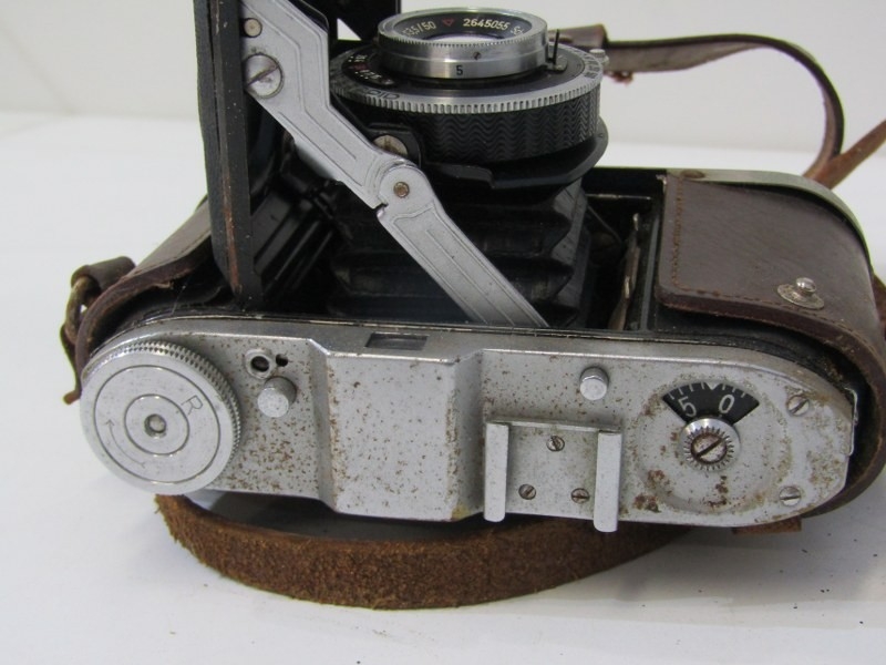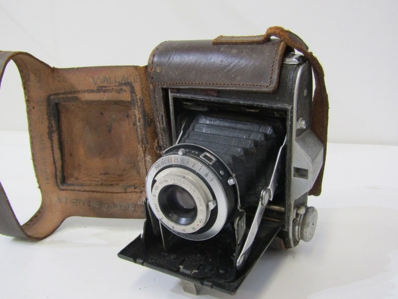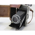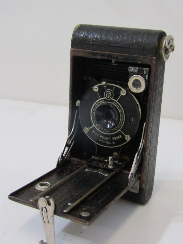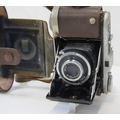 PHOTOGRAPHY - VINTAGE CAMERAS, shelf of mixed vintage cameras; Welmy 6, Zeiss Ikon Compur, Vest Pocket Kodak, Epsilon Rosstar and 4 other vintage cameras in leather cases