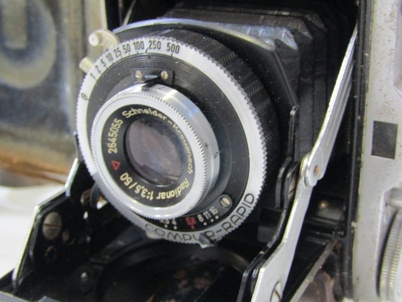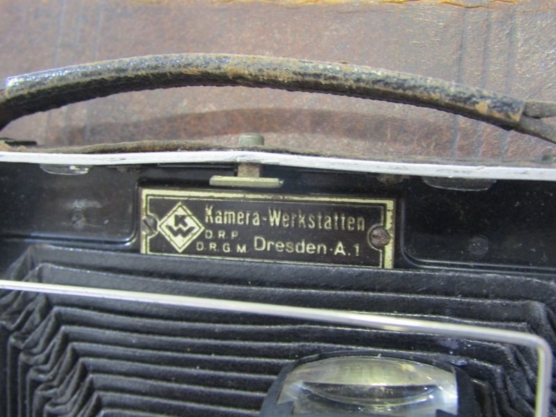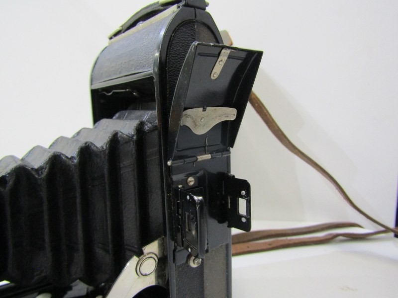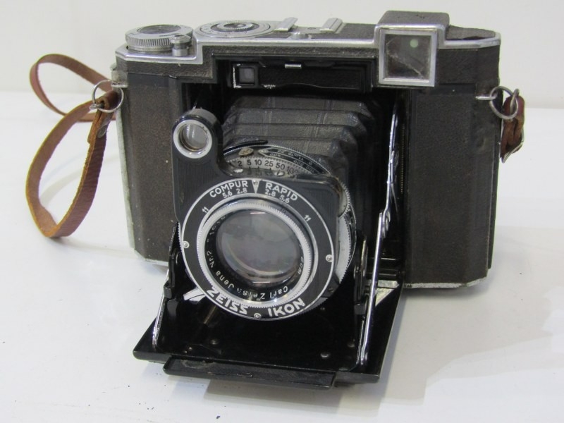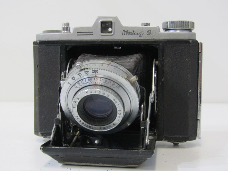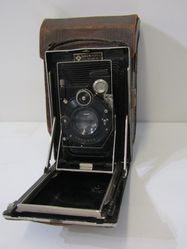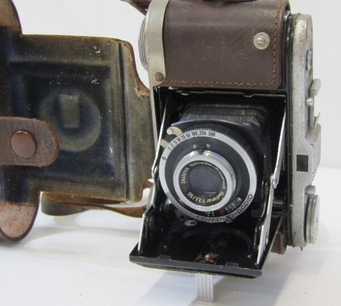 PHOTOGRAPHY - VINTAGE CAMERAS, shelf of mixed vintage cameras; Welmy 6, Zeiss Ikon Compur, Vest Pocket Kodak, Epsilon Rosstar and 4 other vintage cameras in leather cases
