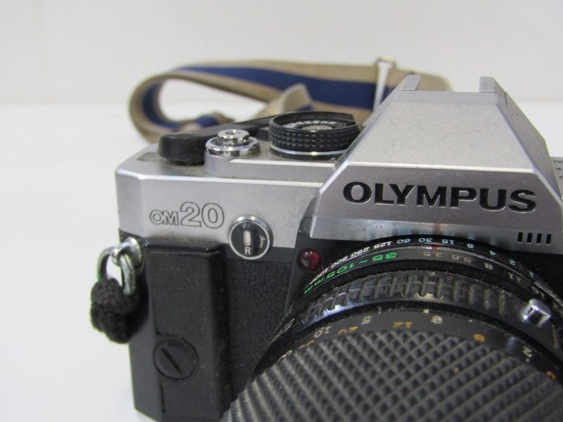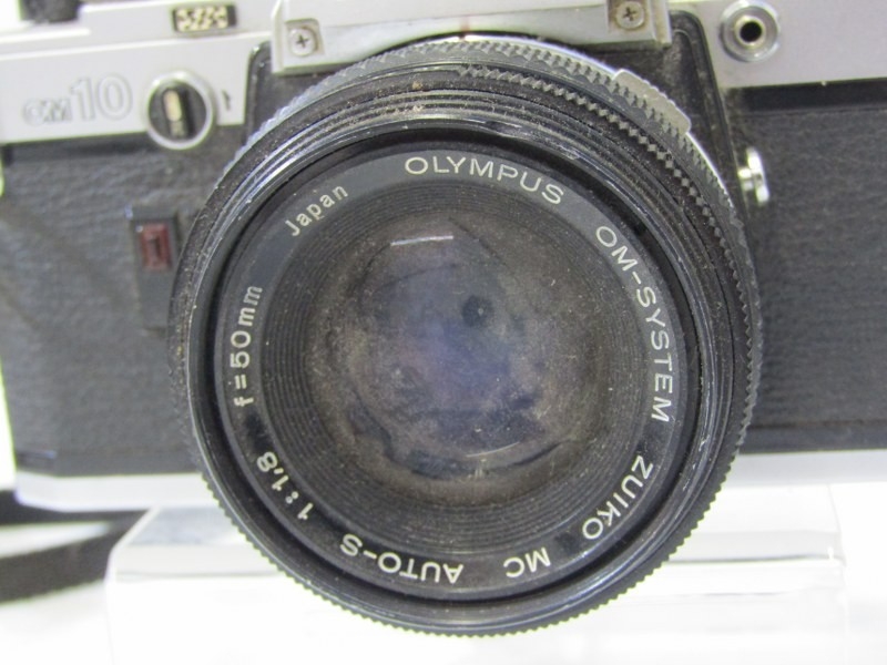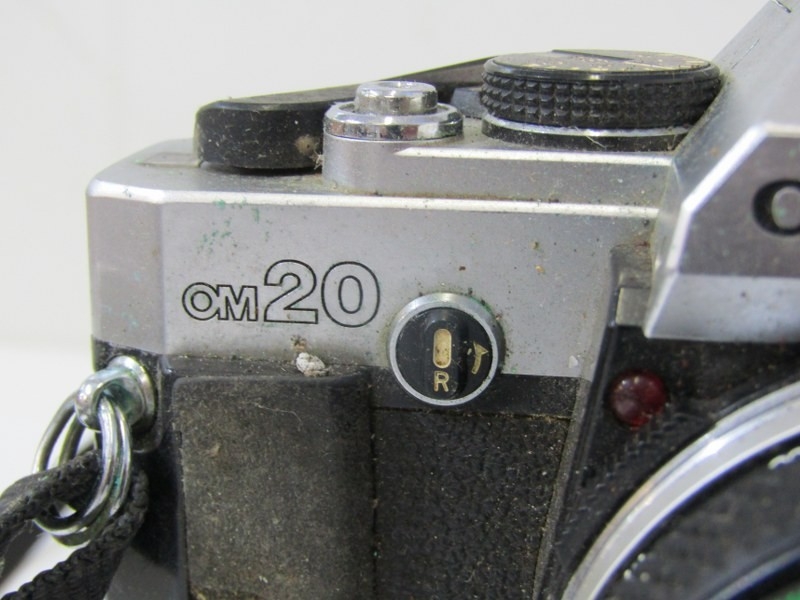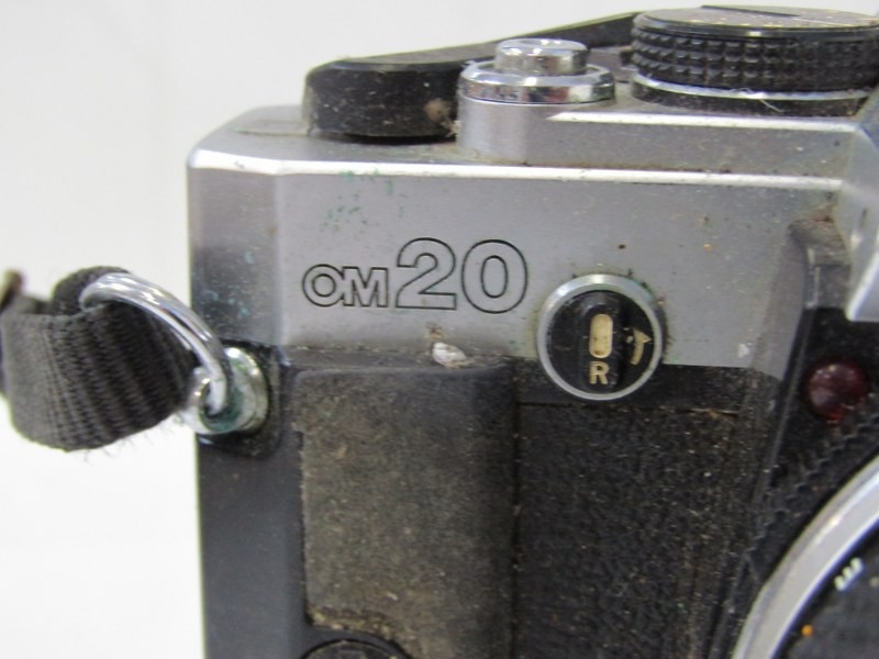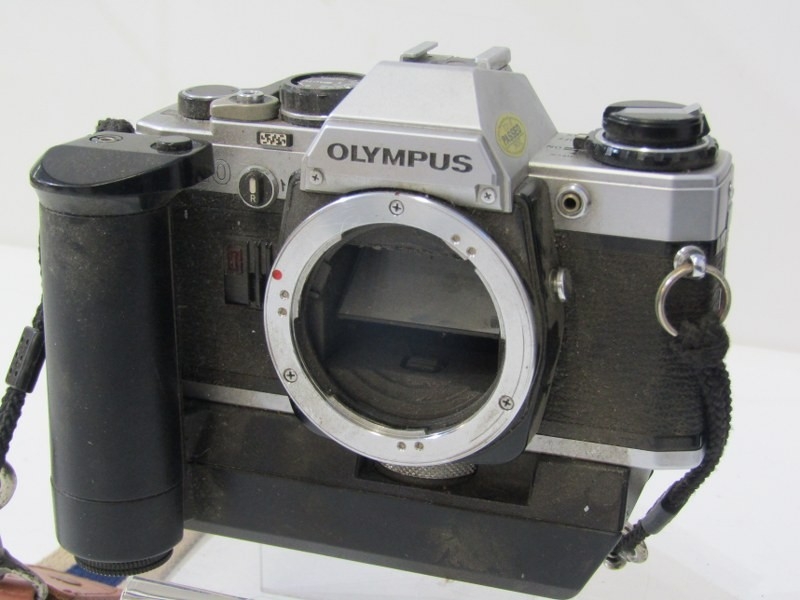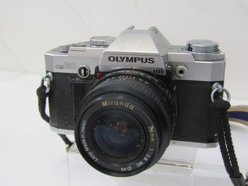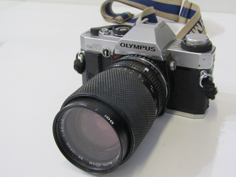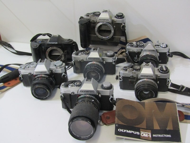 PHOTOGRAPHY; OLYMPUS OM20 35mm camera with Zuiko 35-105mm auto lense and strap, Olympus OM2 camera with 50mm Zuiko lense, Olympus OM30 with Miranda 28mm lense and strap, Olympus OM10 with Zuiko lense, another OM20 camera with Zuiko lense, Olympus OM101 Power Focus camera, a/f and 1 other Olympus camera, a/f