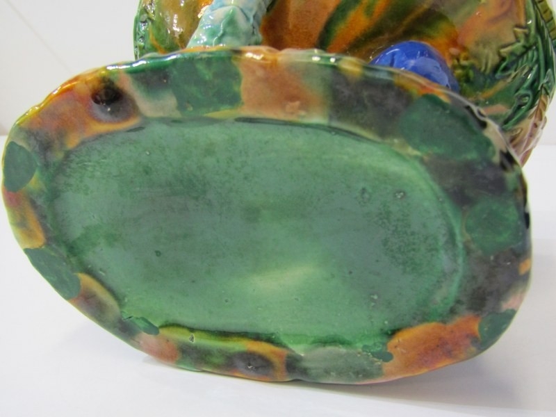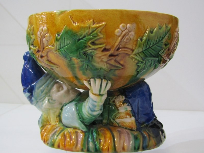 MAJOLICA REPRODUCTION, Majolica stemmed bowl, support in the form of an elf holding a bowl with holly and berry decoration, 19cm diameter