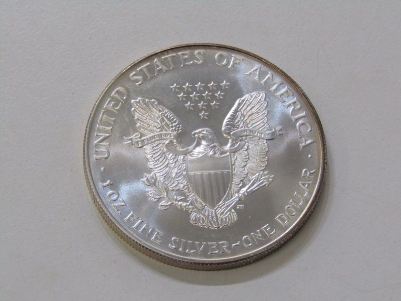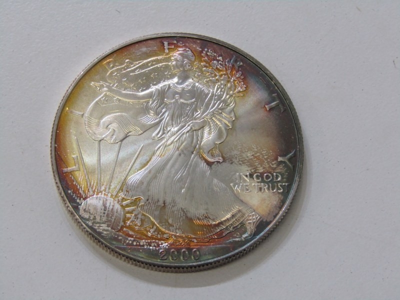 2000 USA ‘Walking Liberty’ Silver Eagle Dollar. High grade example with sharp edges & edge rainbow toning on obverse, 31.103 grams of .999 fineness.