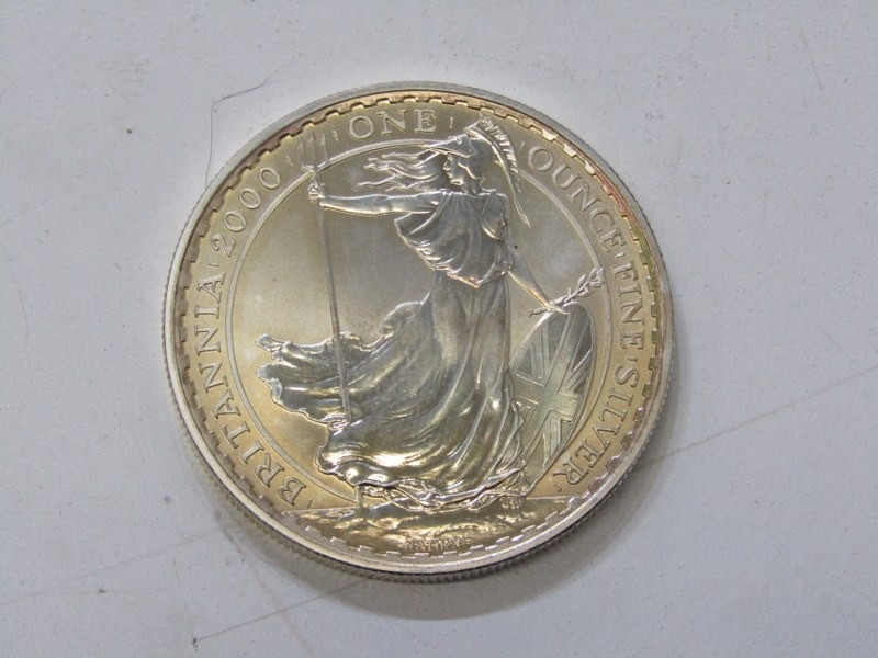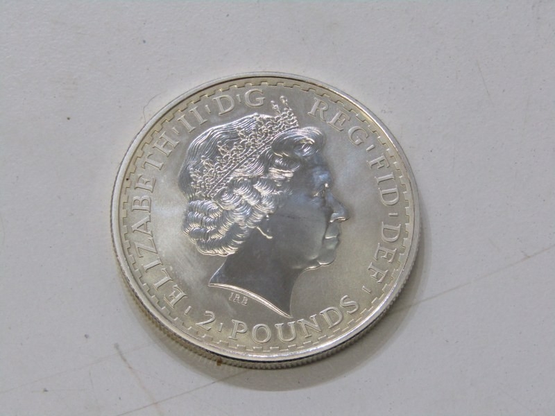 2000 Elizabeth II Fine Silver Britannia 2 Pounds in high grade. One ounce of .999 silver fineness.