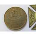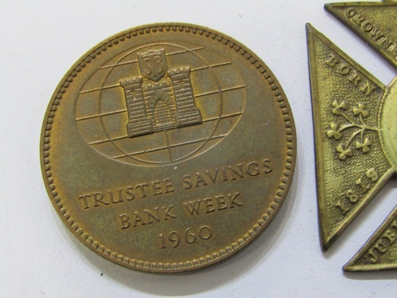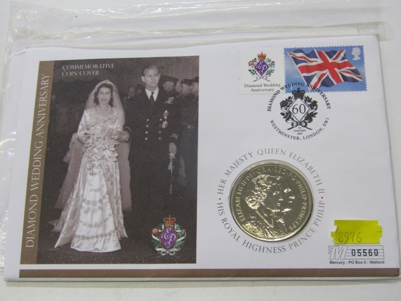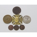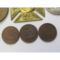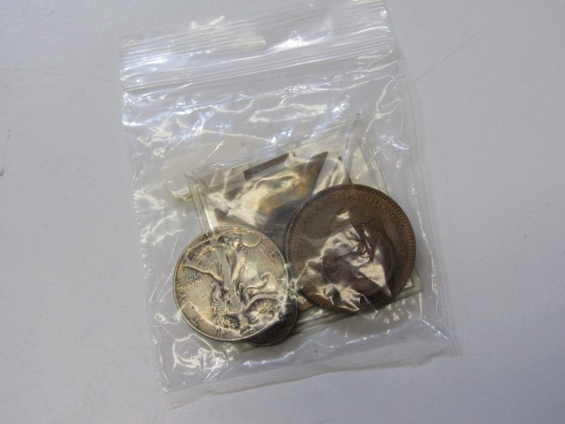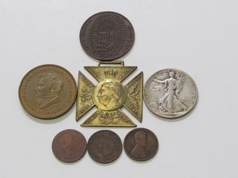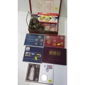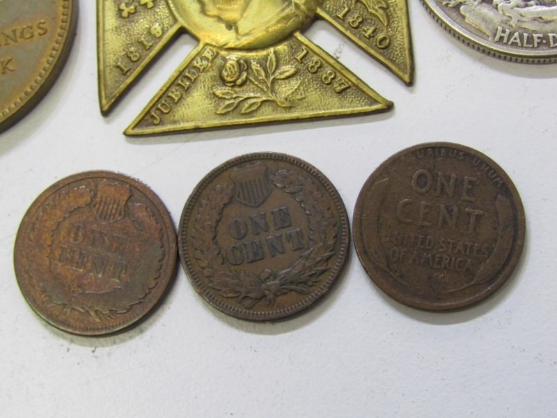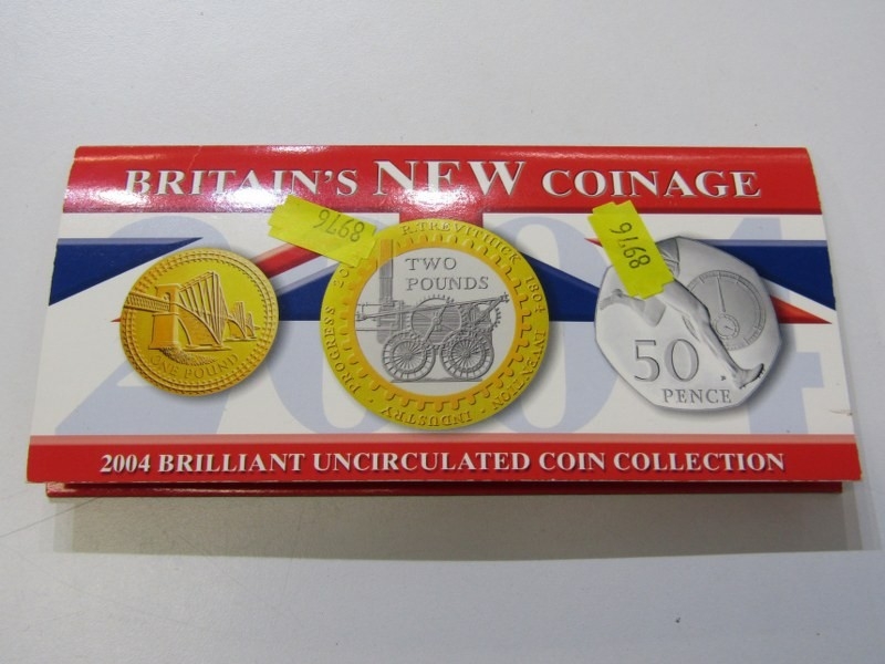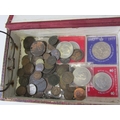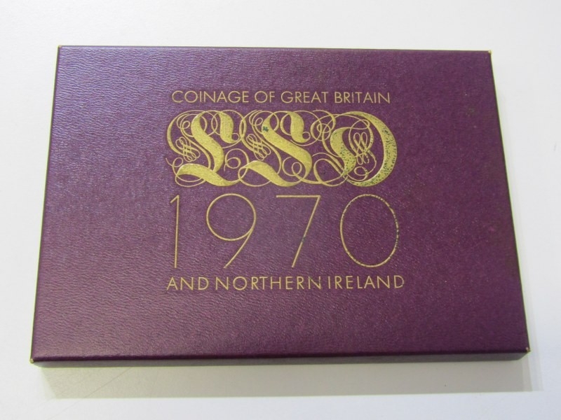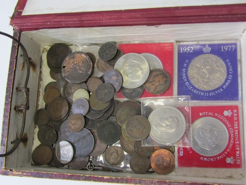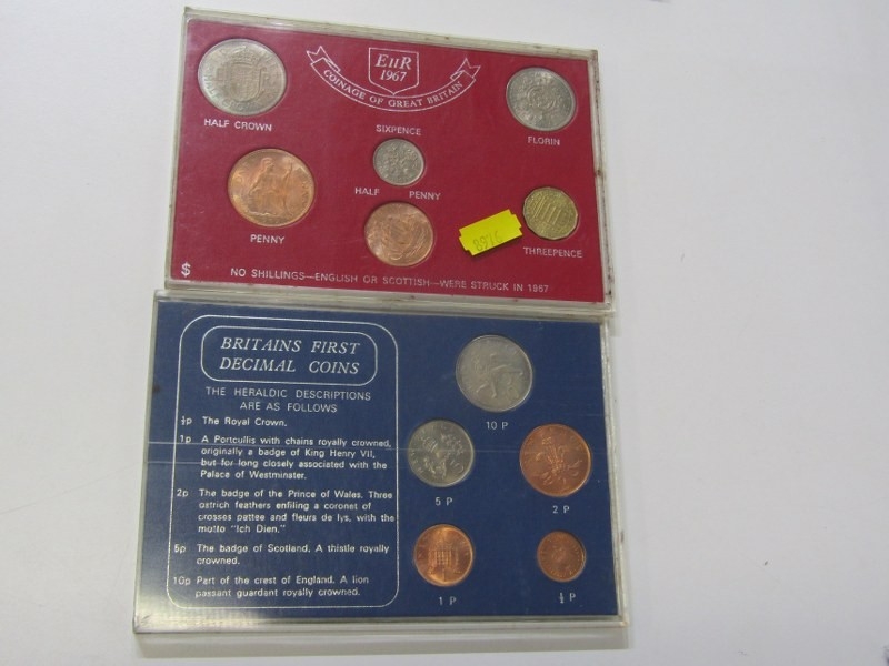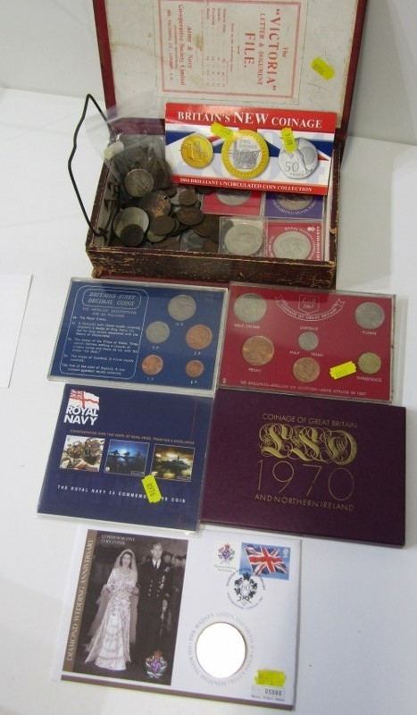 Small file box containing 1967 6-coin set; 1970 8-coin Royal Mint set; Britain’s 1st Decimal 5-coin set; 2004 BUNC 3-coin collection; 5 pound crowns x 2; 19th/20th Century GB crowns to farthings including 1951 FoB crown & Victorian copper; 1946 USA silver half dollar, Indian cents etc.; 1902 ‘Gigantic Wheel’ medallion & plated Military buckle.