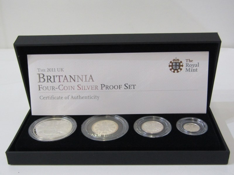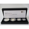 2011 UK Britannia 4-coin silver proof set consisting of £2 (1 oz), £1 (1/2 oz), 50 pence (1/4 oz) & 20 pence (1/10 oz). 60.02 grams of .958 fineness, capsuled in Royal Mint presentation case with CoA. Limited edition of 3500.