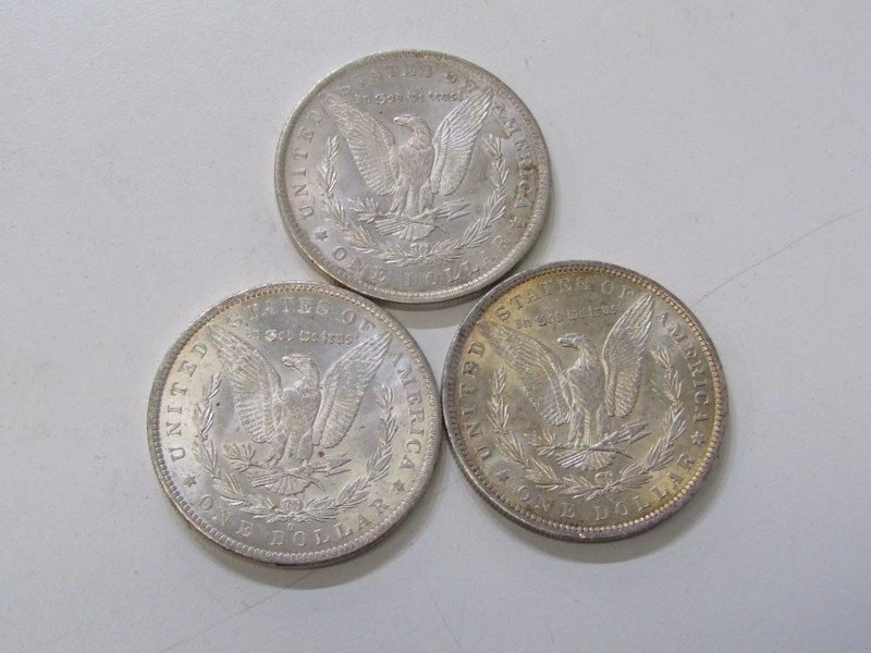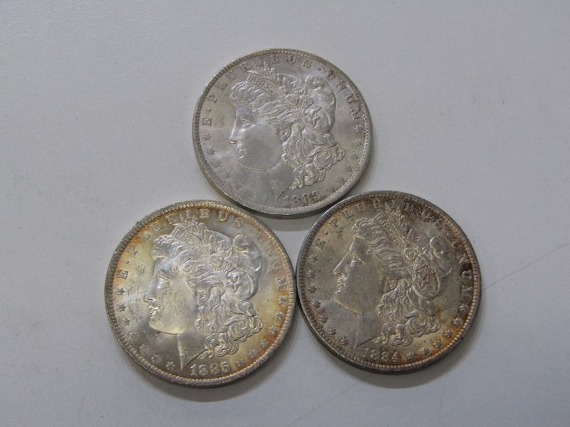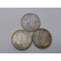 1883-O/1884-O/1885-O USA Morgan Silver Dollars, New Orleans Mint, all in high grade with mixed tonings. 26.7 grams each x 3