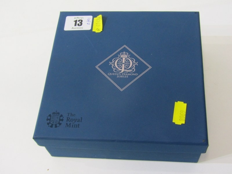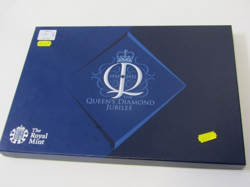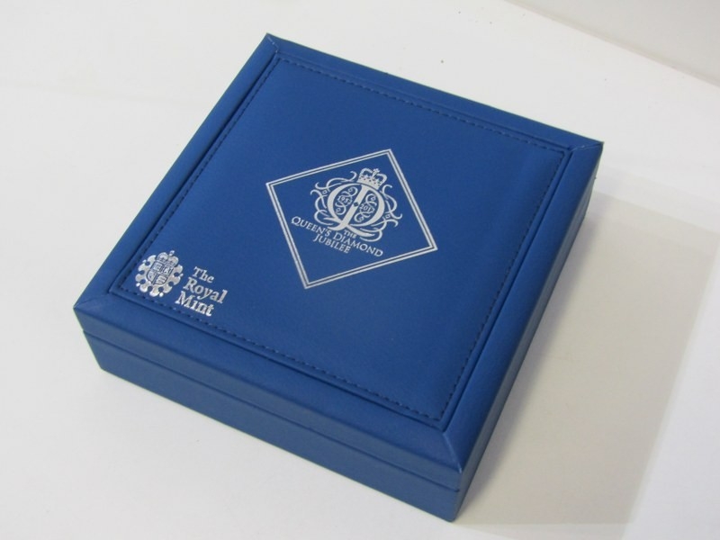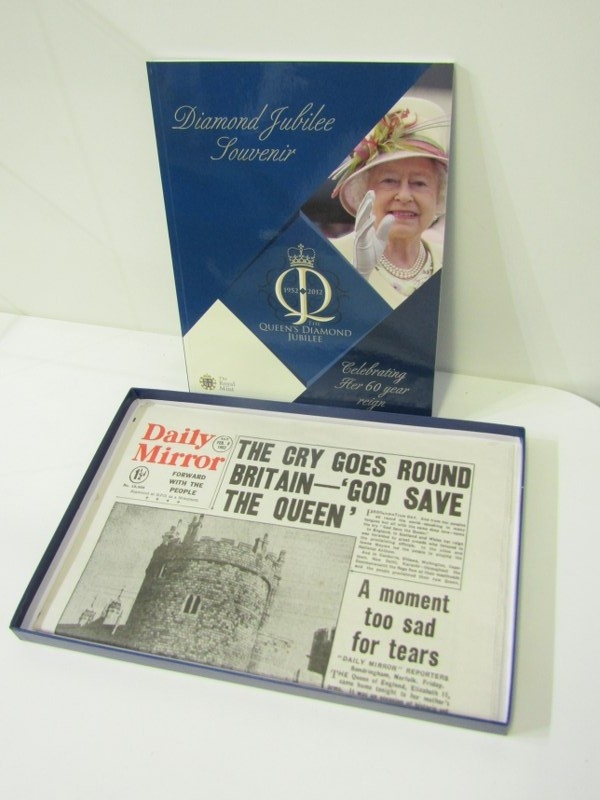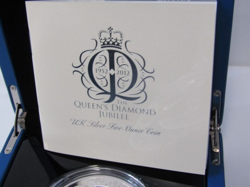 2012 Elizabeth II Fine Silver Proof 5 ounce 10 Pounds, commemorating the Queen’s Diamond Jubilee. Capsuled in Royal Mint bespoke presentation case with accompanying CoA. 156.295 grams of .9999 silver fineness. Limited edition 1130/1952. Together with a Diamond Jubilee Souvenir booklet & Daily Mirror newspaper facsimile.