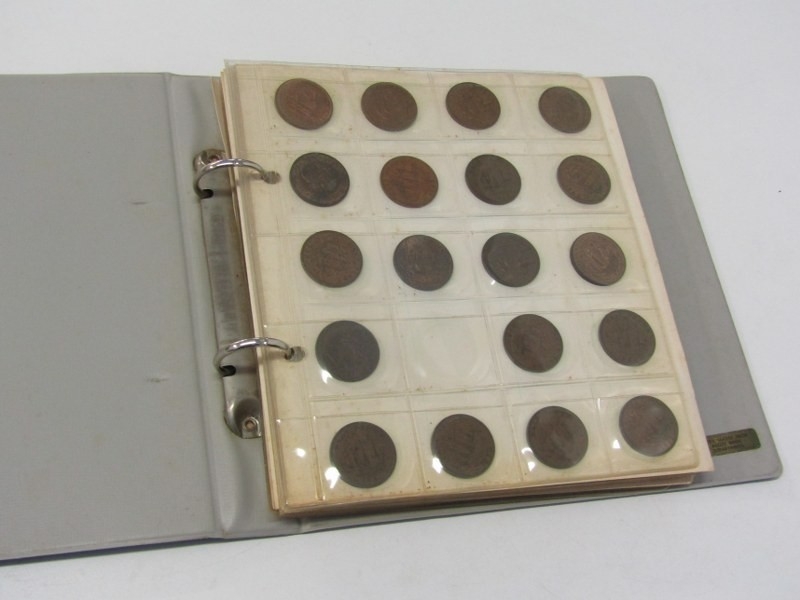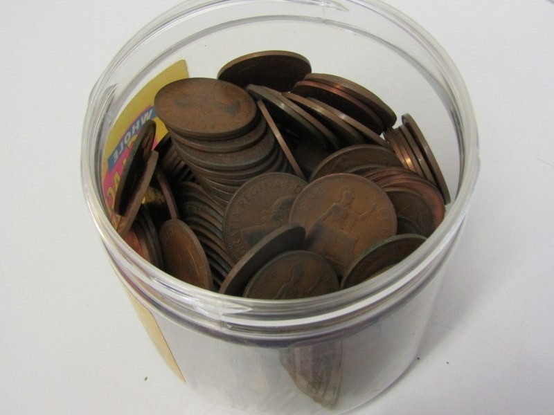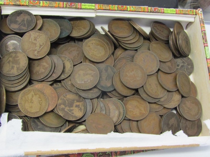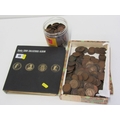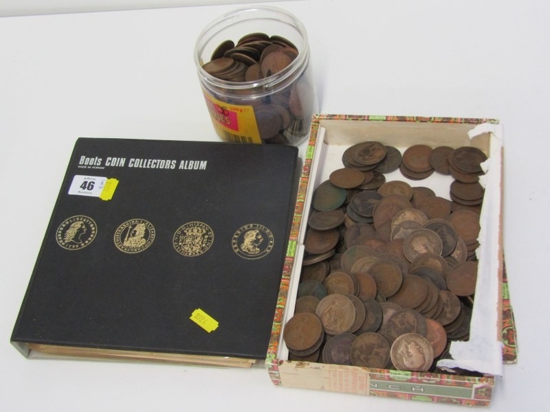 A Boots coin album of 19th/20th Century pennies & halfpennies etc., a cigar box of 19th/20th Century pennies & a tub of 20th Century pennies.
