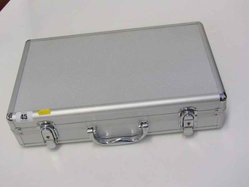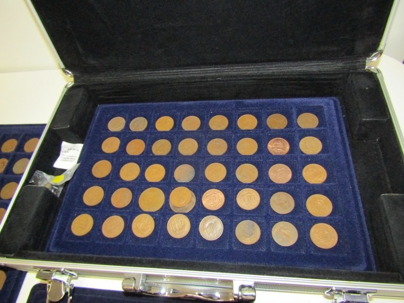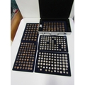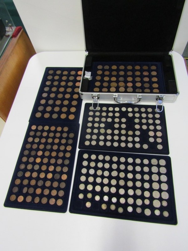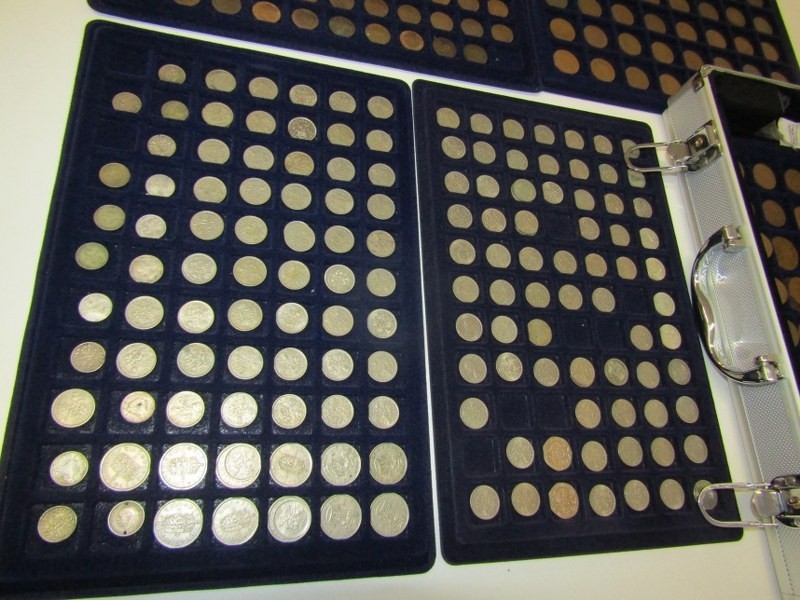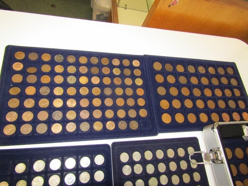 An aluminium 5-tray coin case in good condition, containing pre-1947 silver sixpences x 9 & threepences x 16 together with a collection of mostly 20th Century sixpences, halfpennies & farthings etc.