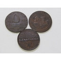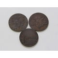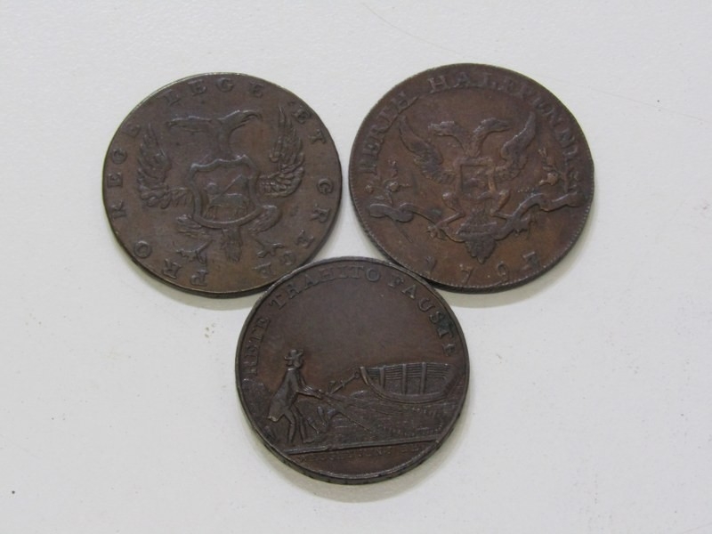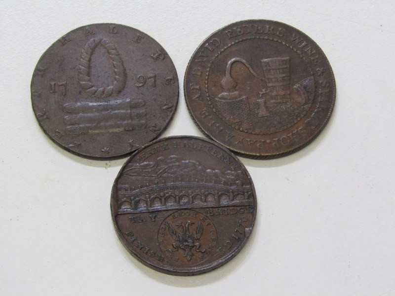 Perth Halfpenny Copper Tokens x 3: circa 1770 Ferrier's Tay Bridge, salmon fisherman dragging a net ashore in high grade with super fine detail & lovely toning; 1797 David Peter’s Wine & Spirit still; 1797 hank of yarn above a package of dressed flax, both in good grade & toning.