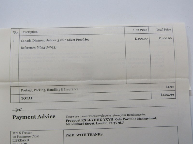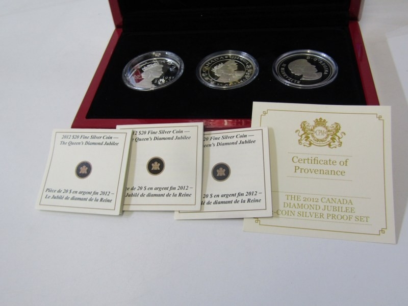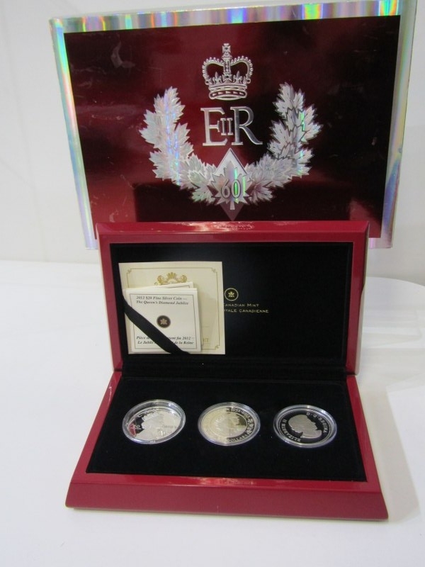 2012 Canada Diamond Jubilee 3-coin fine silver proof $20 set . Capsuled in Royal Canadian Mint presentation box with CoA. Each coin weighs 31.39 grams of .999 fineness. Limited to 2500 sets.