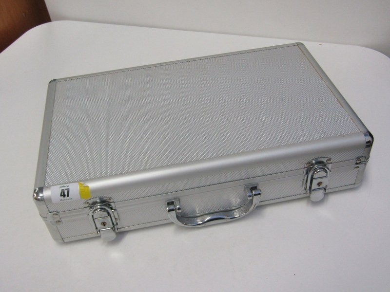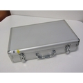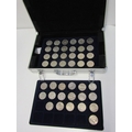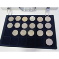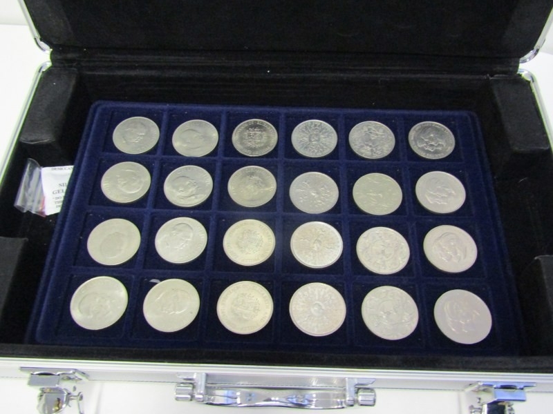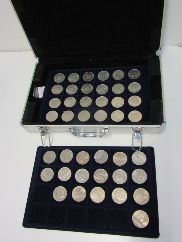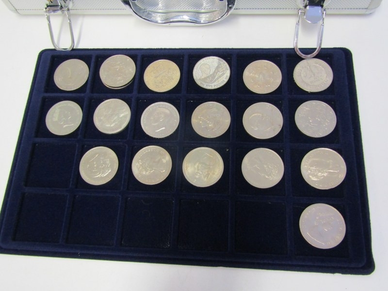 An aluminium coin case in good condition, containing 2 trays of 5 pound crowns x 8, 1951 FoB crown & other crowns
