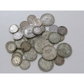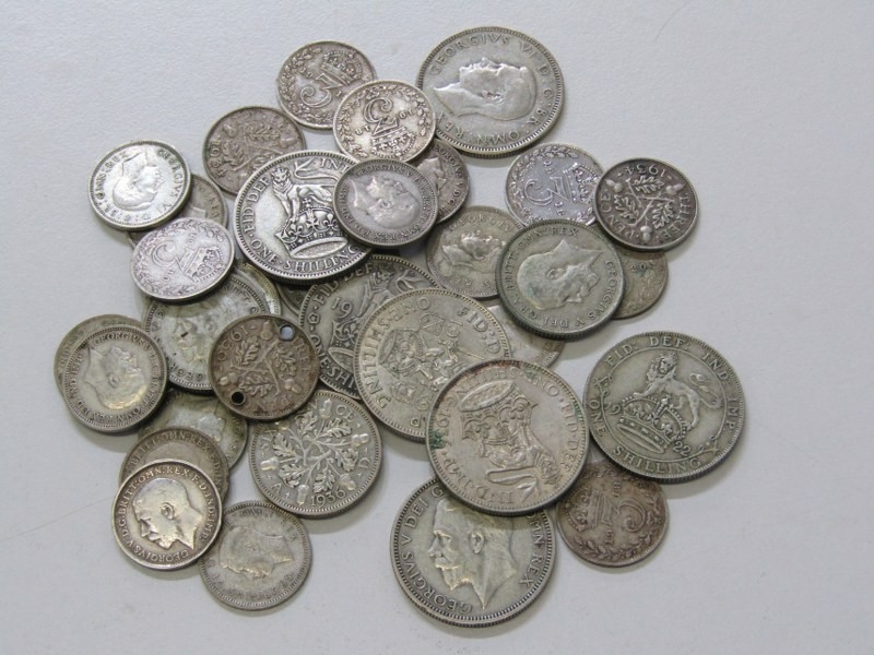 Pre-1947 silver shillings x 7, sixpences x 6 & threepences x 23 in mixed grades, 86 grams approx.