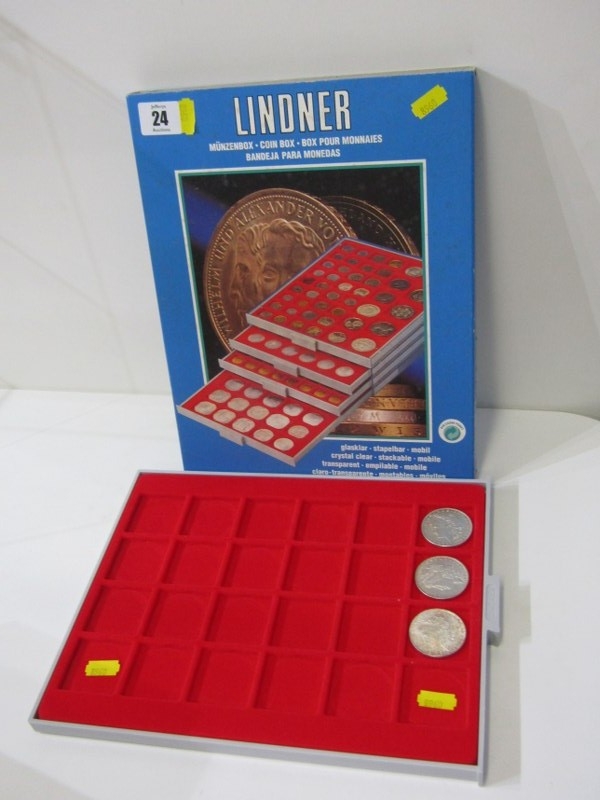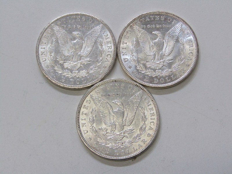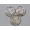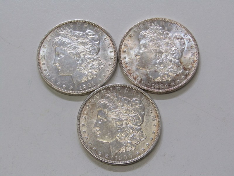 1900-O/1901-O/1904-O USA Morgan Silver Dollars, New Orleans Mint, all in high grade with mixed tonings, together with a Lindner coin tray (3)