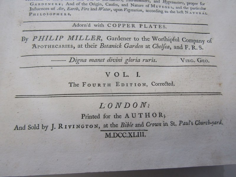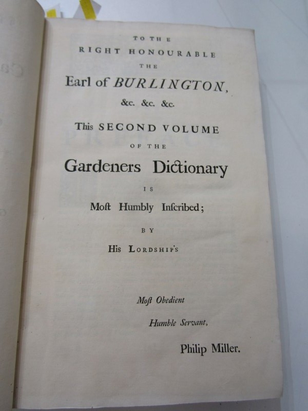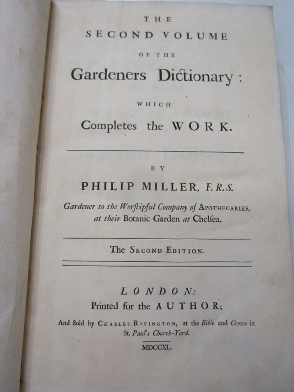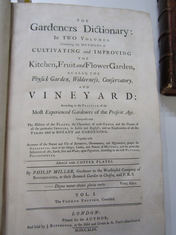 MILLER'S GARDENER'S DICTIONARY, 1743 Miller's Gardener's Dictionary in 2 volumes, folio 4th edition. Henry 1109, Henry notes that the 2nd volume of this edition as here contains some of the 2nd edition of the 2nd volume from 1740. In total frontice piece and 11 full page plates, some folding
