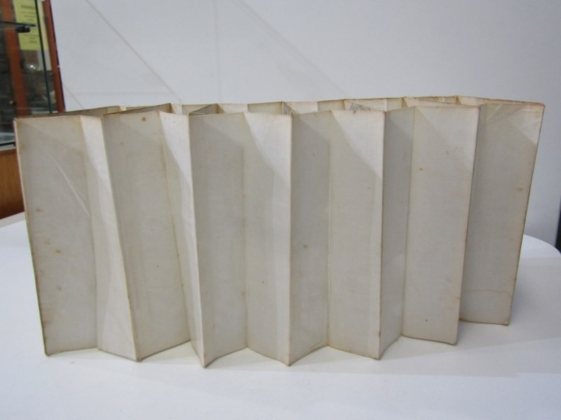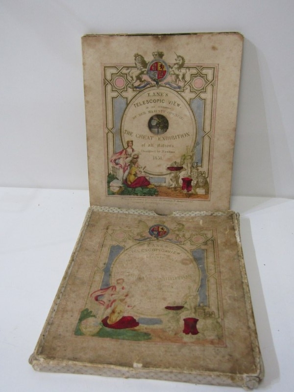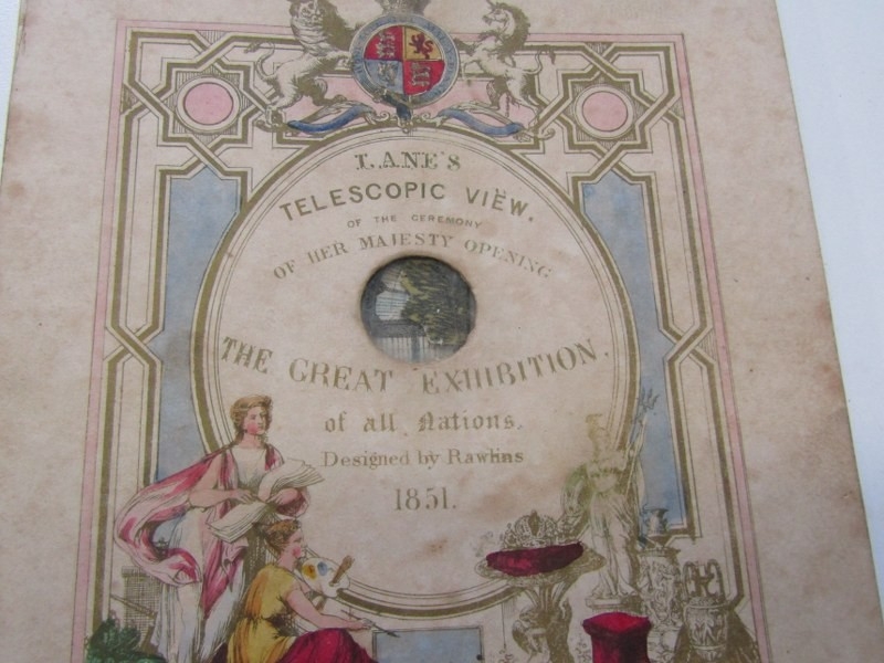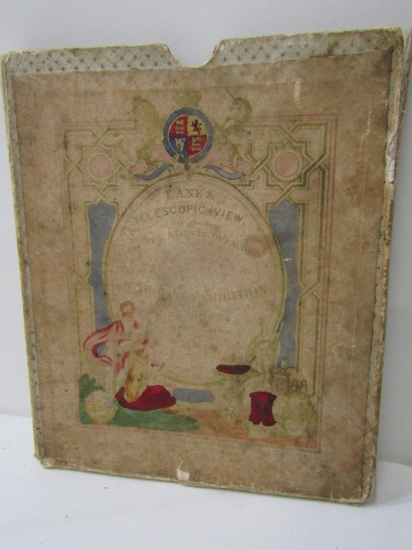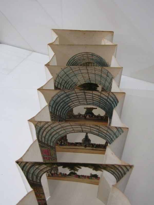 VICTORIAN GREAT EXHIBITION OPTICAL TOY, a Lane's concertina style peep show titled, 'Lane's telescopic view of the ceremony of Her Majesty opening The Great Exhibition of All Nations' 1851. Hand coloured with 5 sections and background united by a linen concertina. 10cm x 15cm