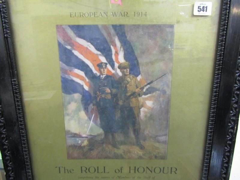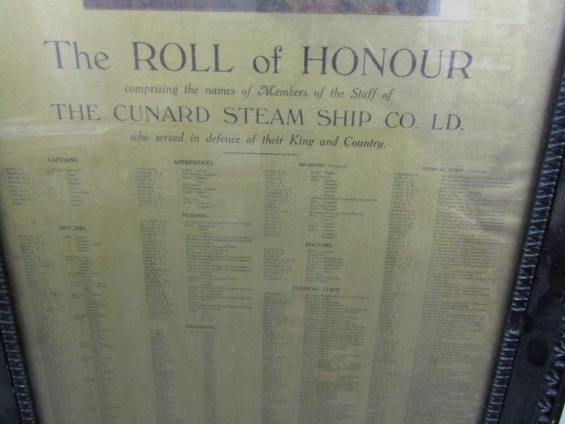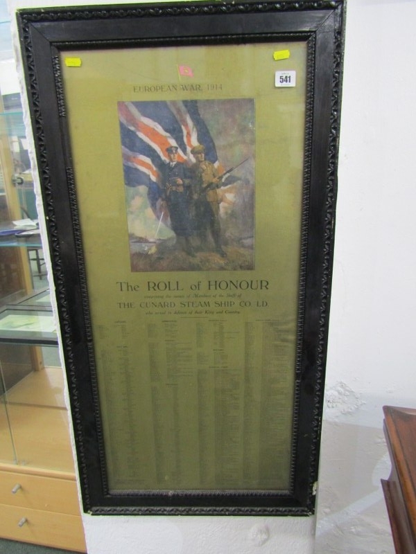 SHIPPING MEMORABILIA, a Cunard steamship roll of honour, European War 1914, contained in a dark ebonised frame, 94cm x 48cm
