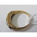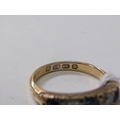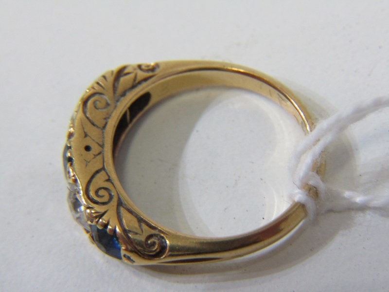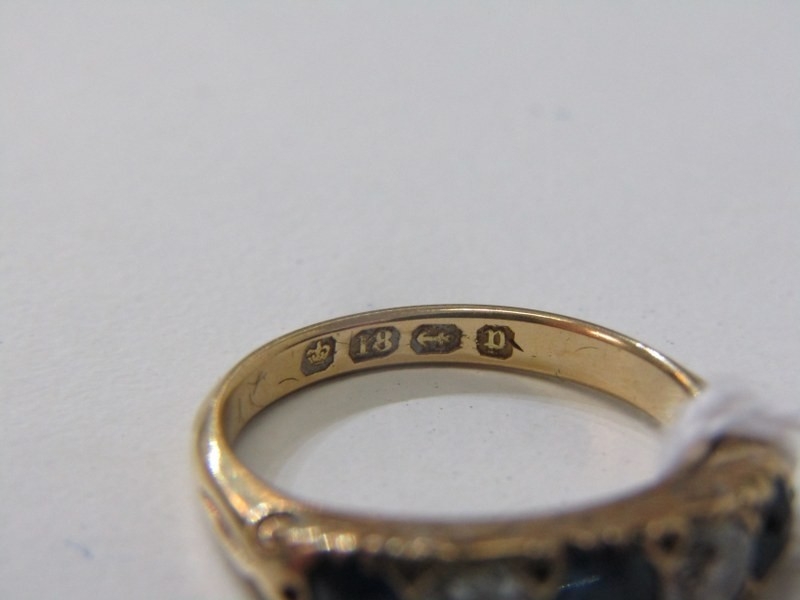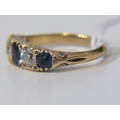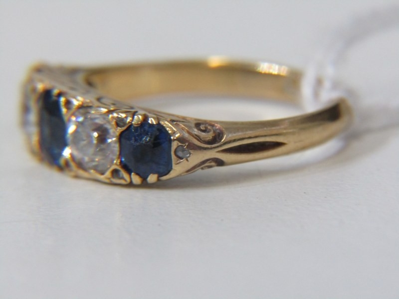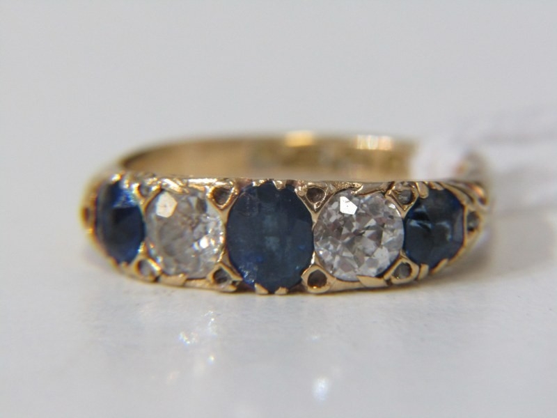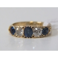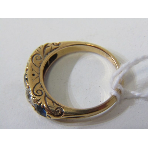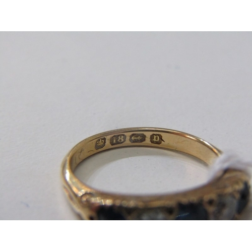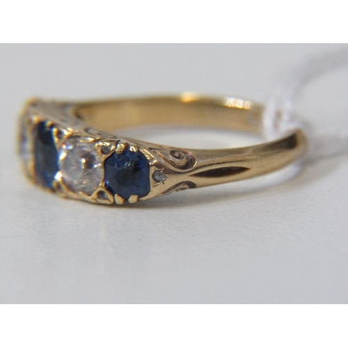 A 5-STONE SAPPHIRE AND DIAMOND RING, an 18ct yellow gold ring set with a central oval sapphire, flanked by graduated diamonds and further sapphires, size L/M