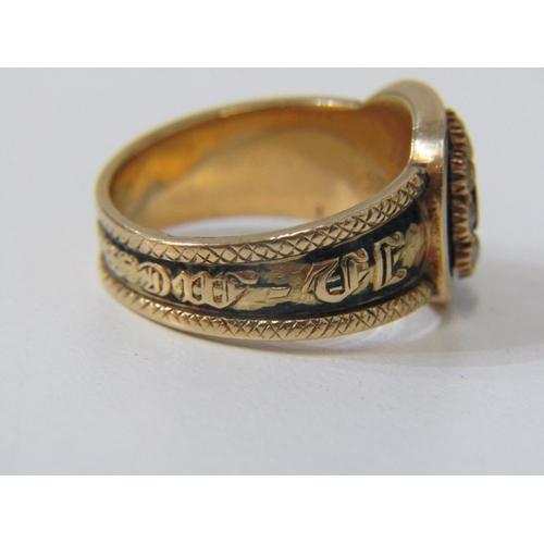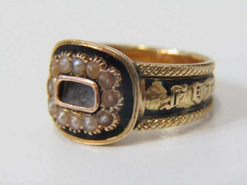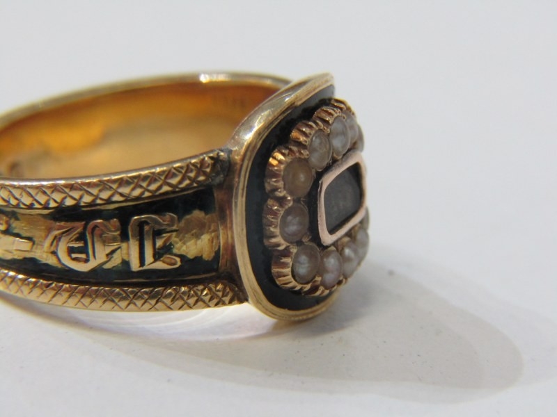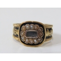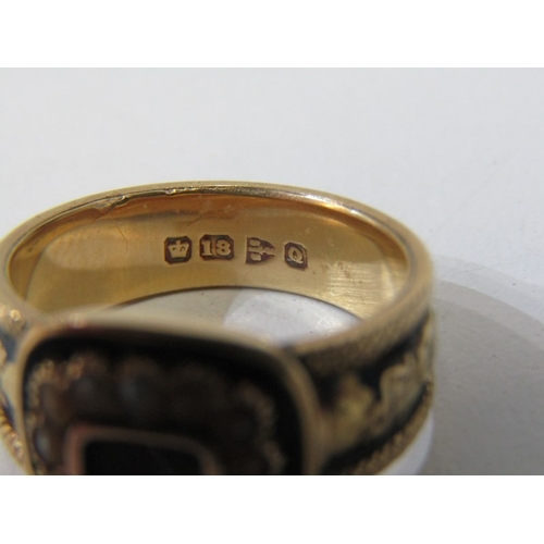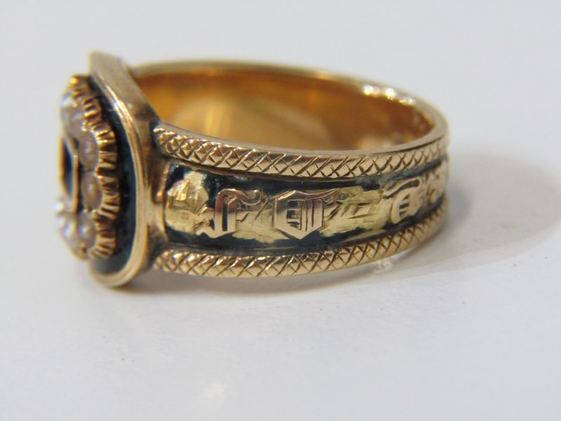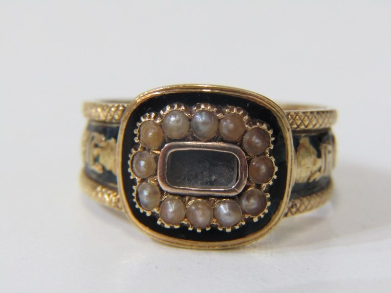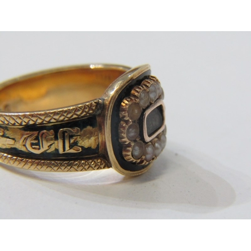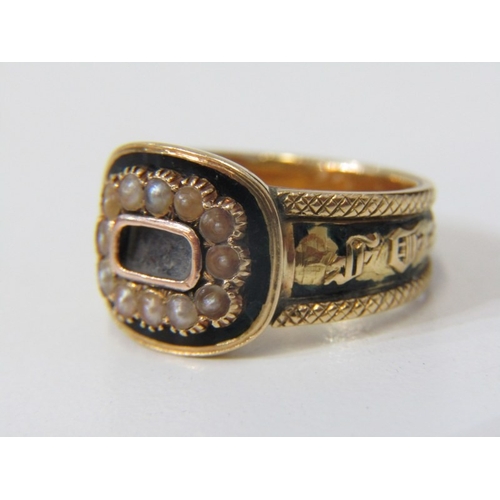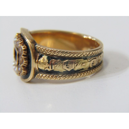 ANTIQUE GOLD MOURNING BROOCH, an 18ct yellow gold brooch set with pearls and black enamel in a fancy ring mount, size P/Q, 7.5 grams