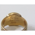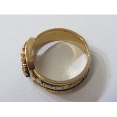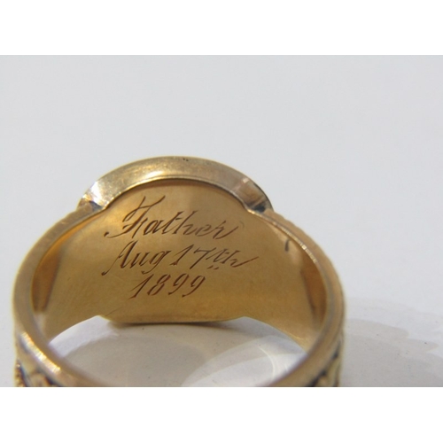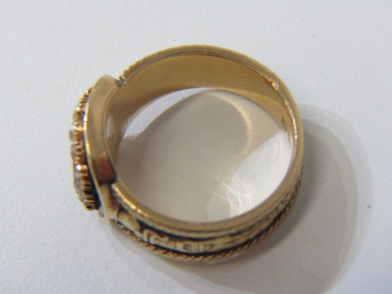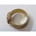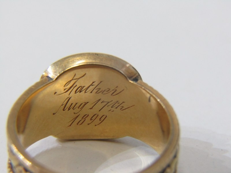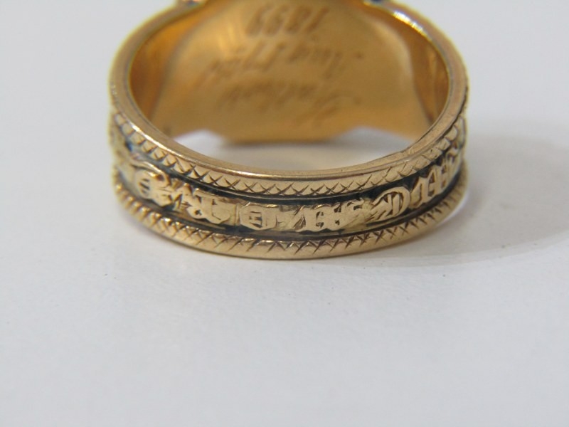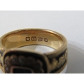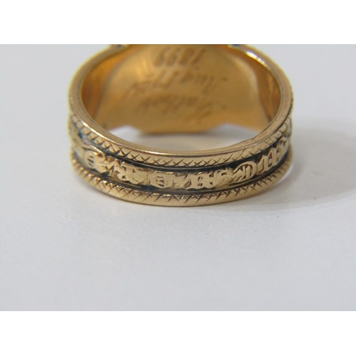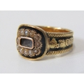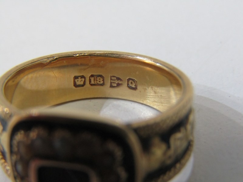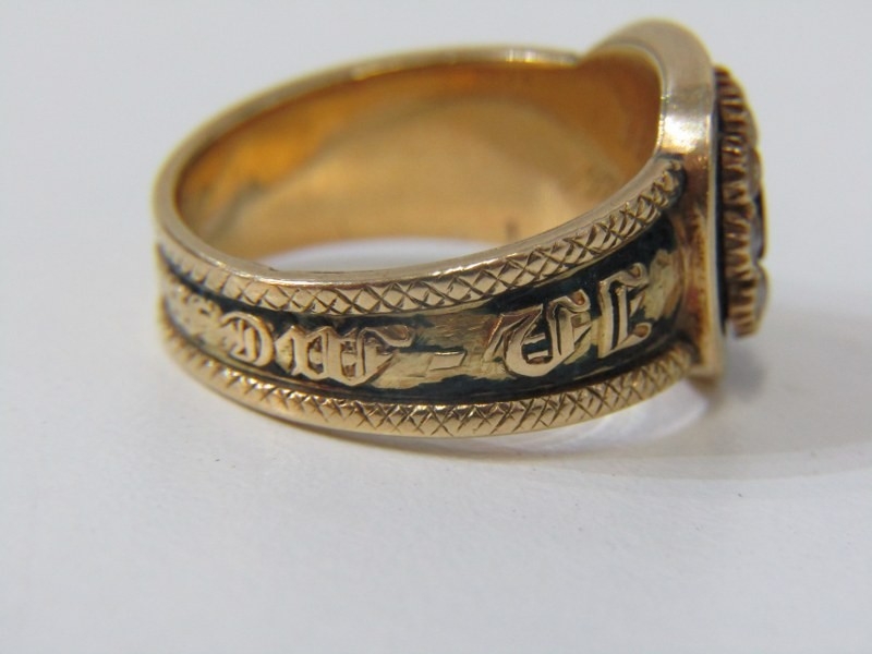 ANTIQUE GOLD MOURNING BROOCH, an 18ct yellow gold brooch set with pearls and black enamel in a fancy ring mount, size P/Q, 7.5 grams