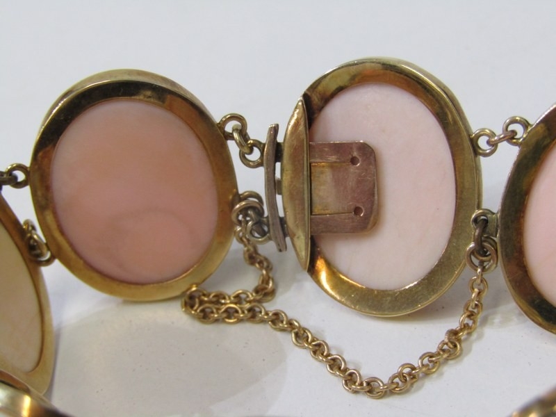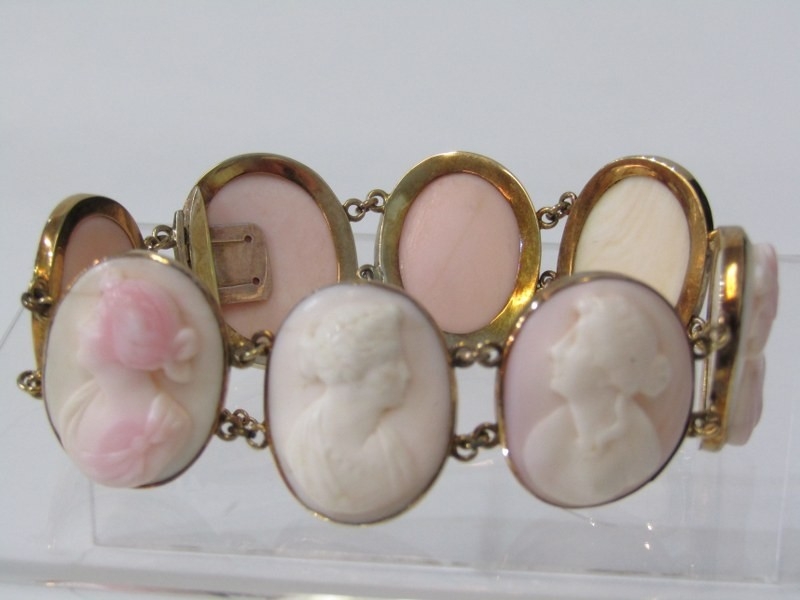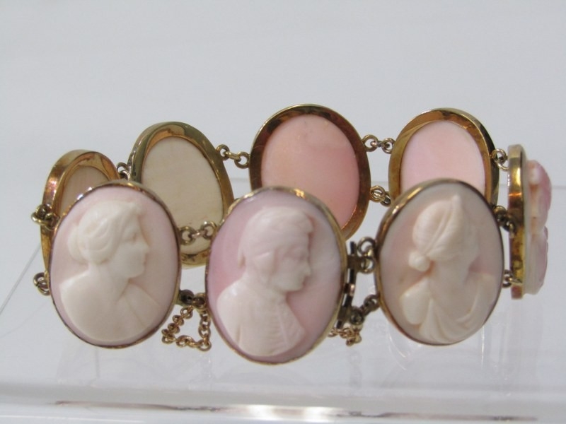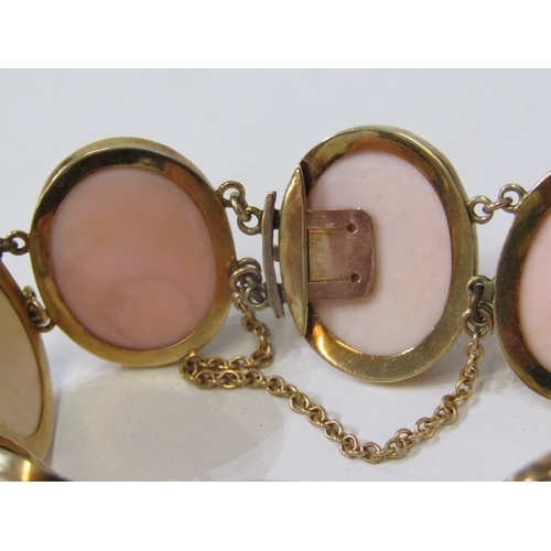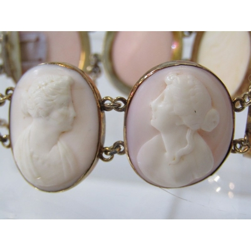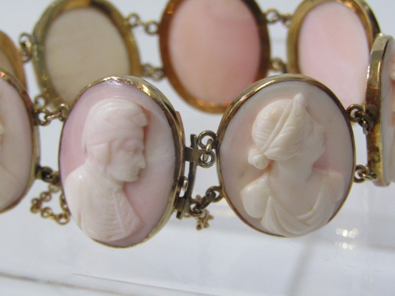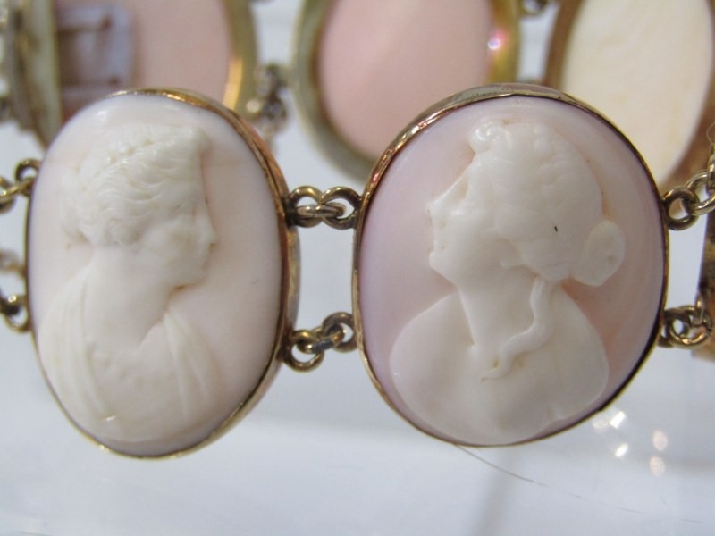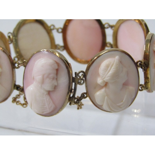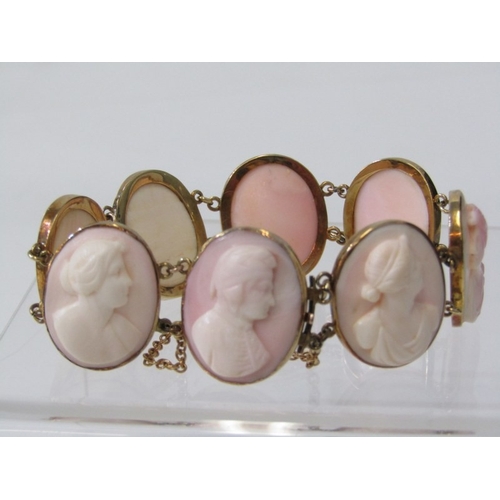 ANTIQUE CAMEO BRACELET, 8 oval potrait cameos set in yellow gold mounts, tests as approximately 14ct, 34 grams overall