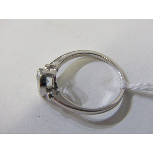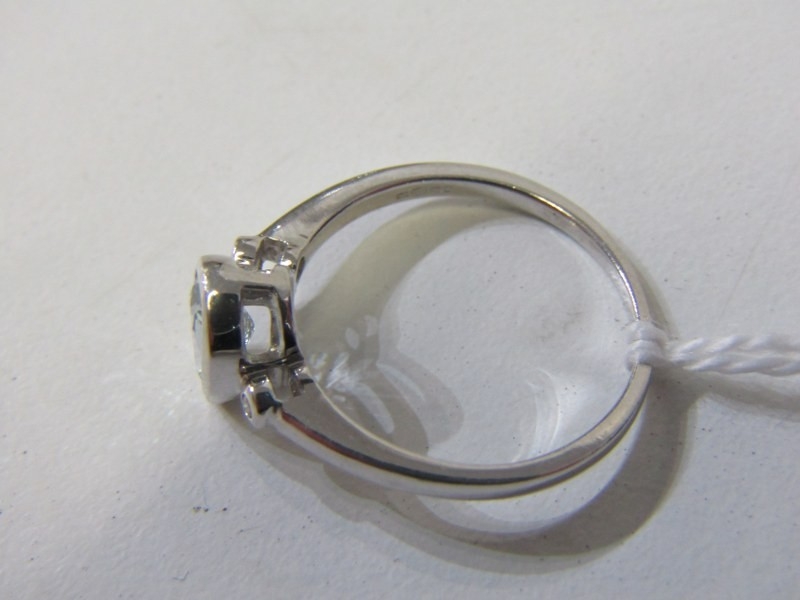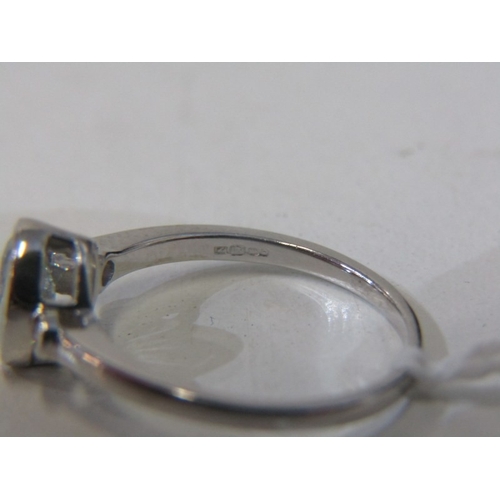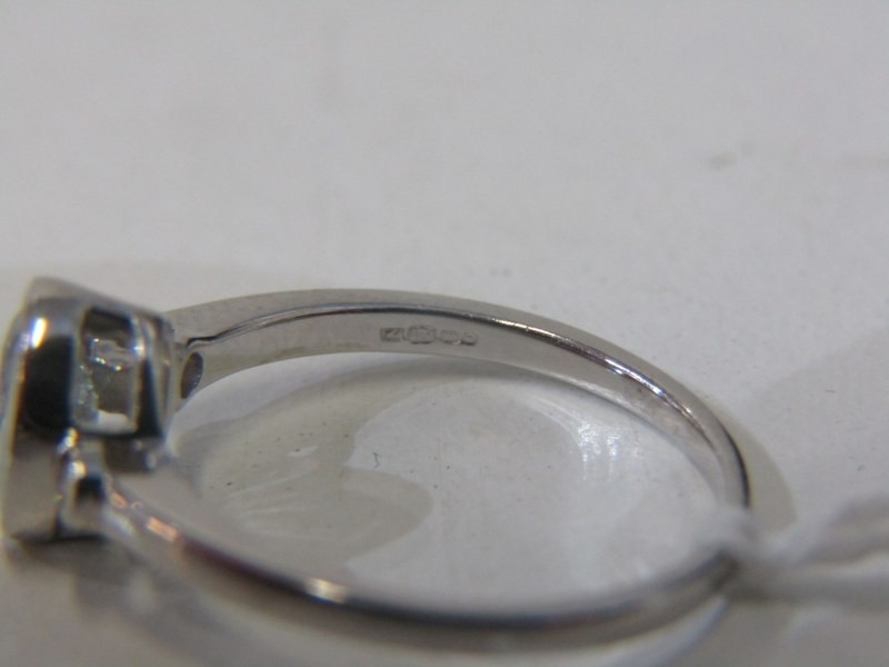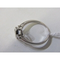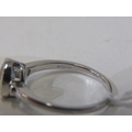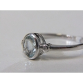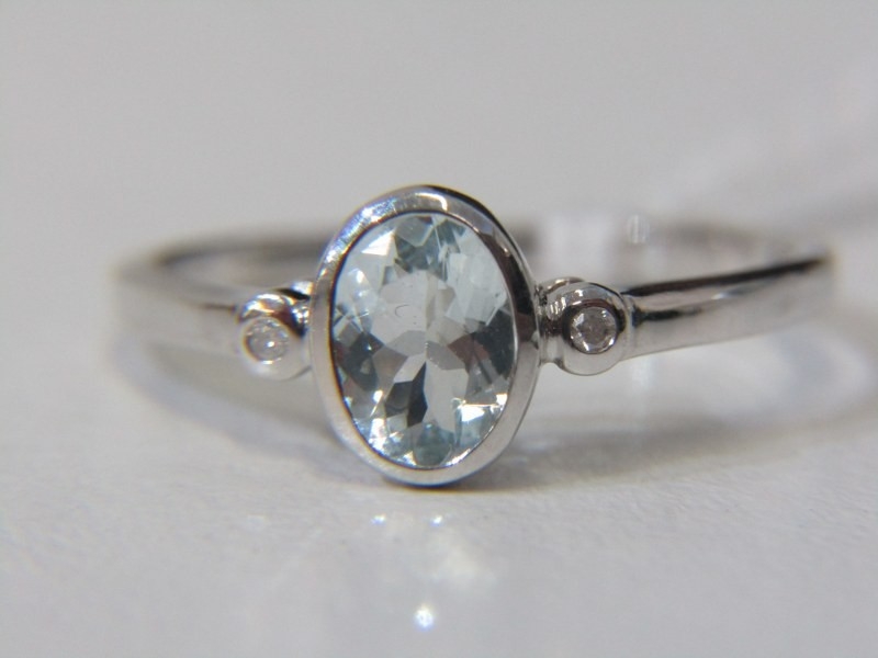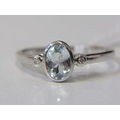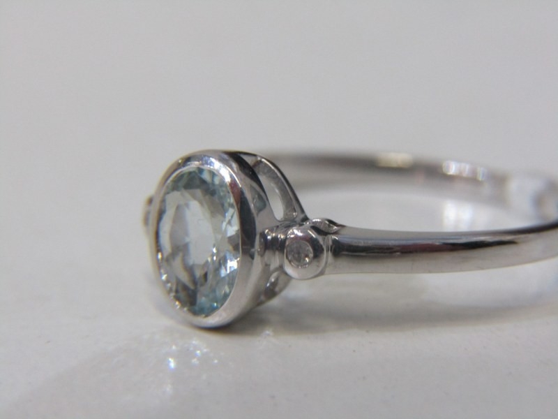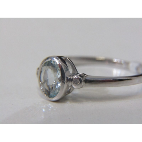 AQUAMARINE AND DIAMOND RING, 9ct white gold ring set with a oval aquamarine with approximately 7mm spread, with diamonds to either side, size M