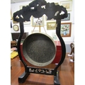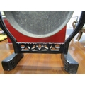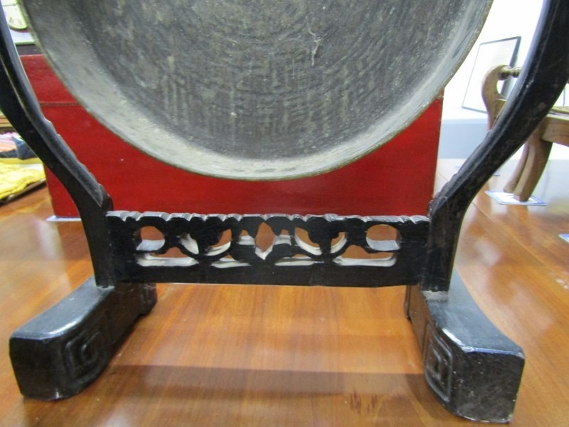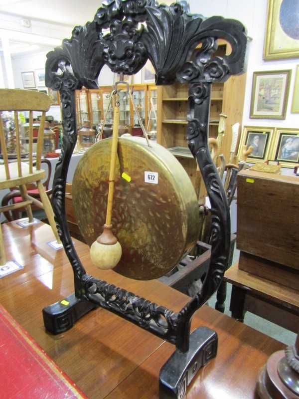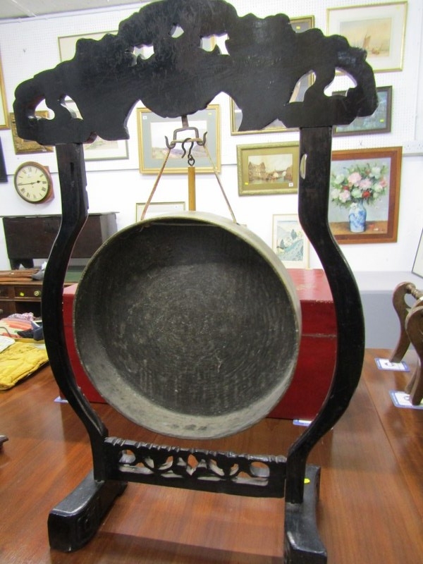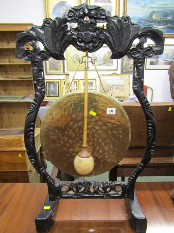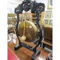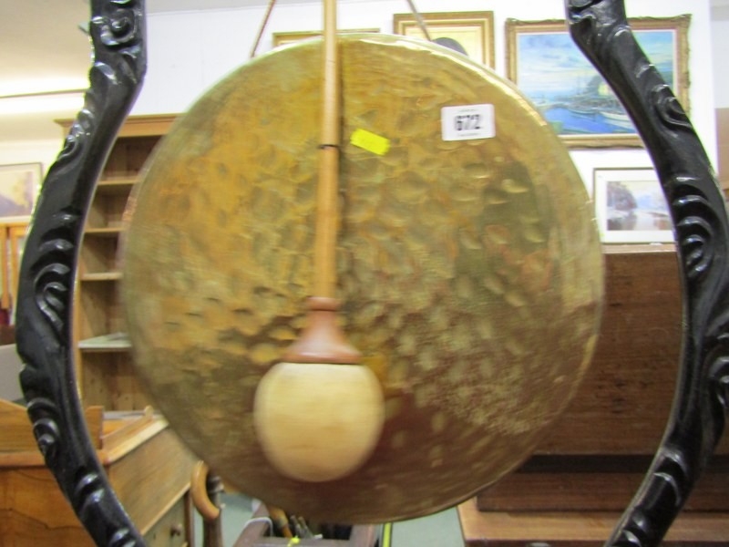 DINNER GONG, a late 19th Century dinner gong, hammered brass gong on an ebonised oriental design frame, elaborately carved with a wood handled beater, 80cm height 49cm width