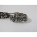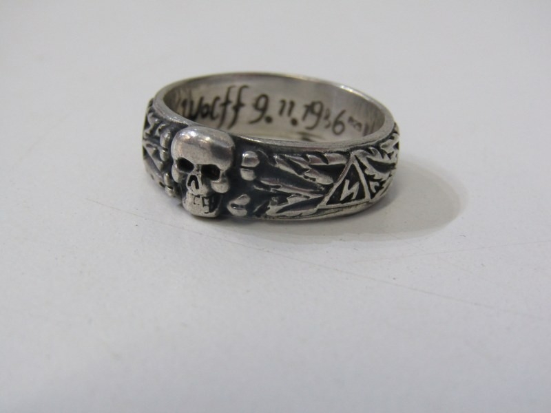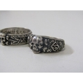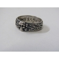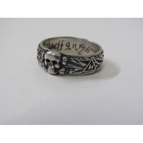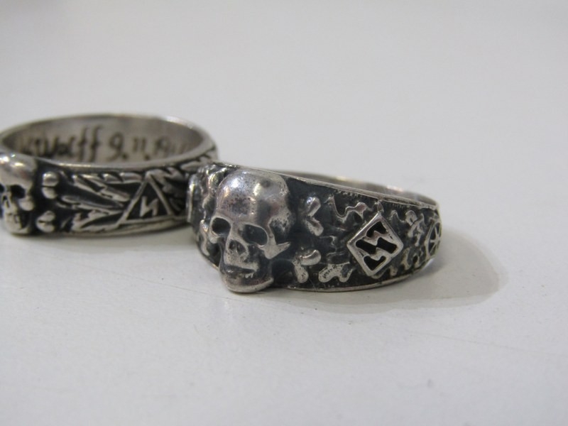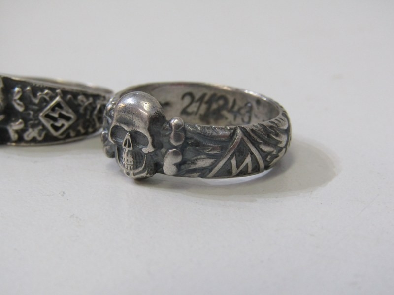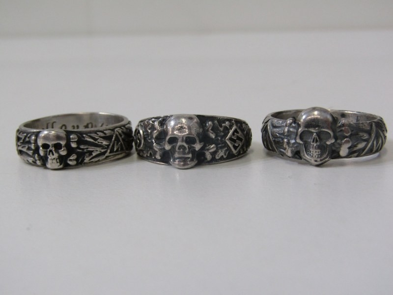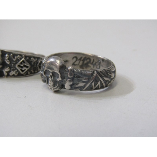 GERMAN SILVER RINGS, 3 silver Nazi style rings decorated with skulls and crossbones, various designs and sizes