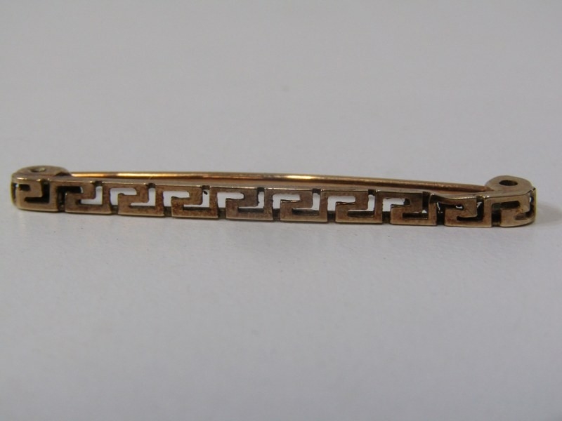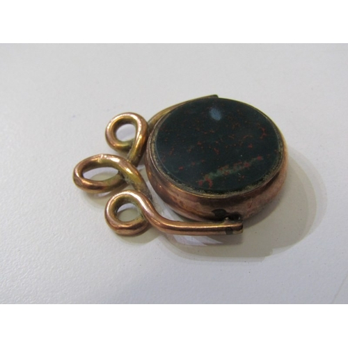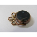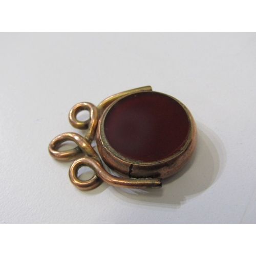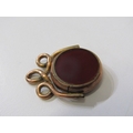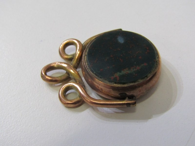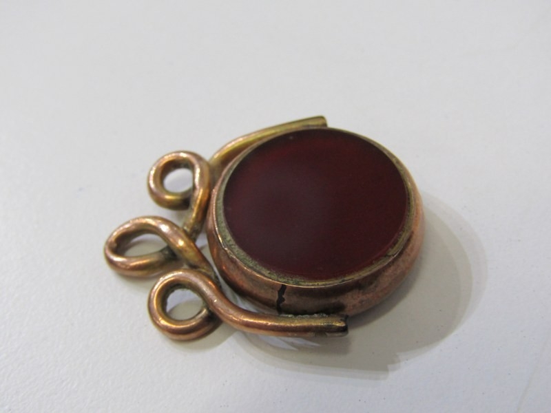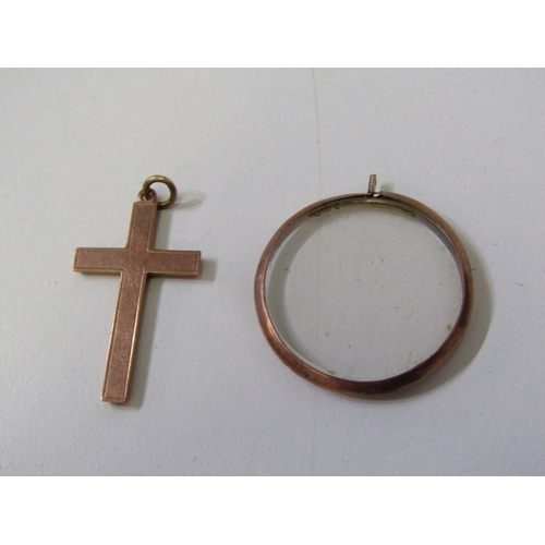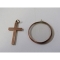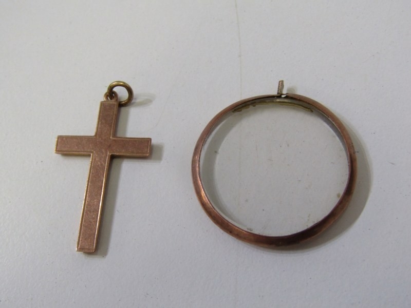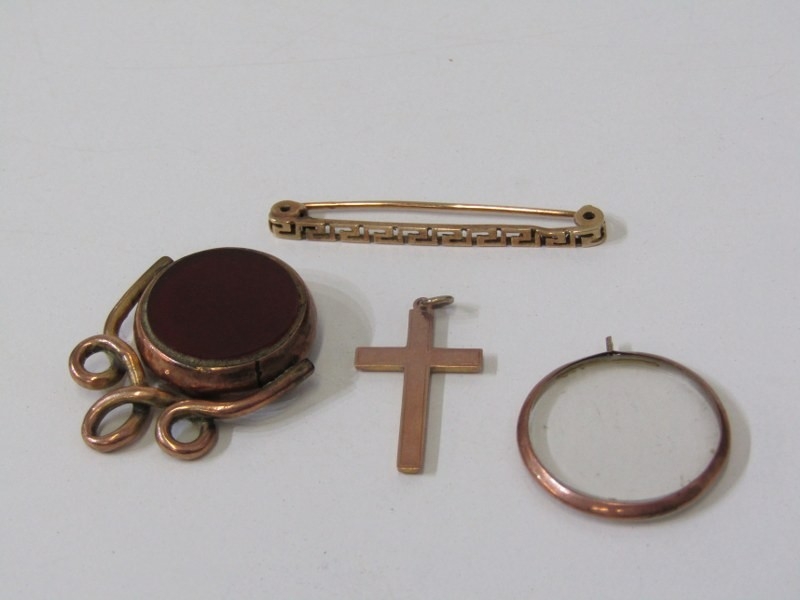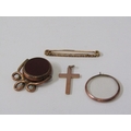 GOLD ITEMS, 9ct gold bar brooch and cross, a gold stone set swivel fob set with cornelian and a gold framed glazed pendant, 13.5 grams overall